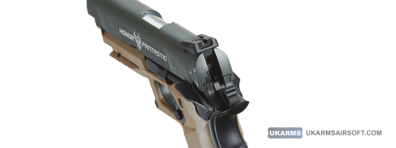 Upgrade your kit with the HFC Classic .45 Series metal CO2 gas blowback airsoft pistol in black and desert tan. Built with a full metal slide and a durable polymer lower receiver, this pistol delivers an authentic weight and a realistic handling feel ideal for training and field use. Powered by 12g CO2, the Classic .45 produces consistent muzzle energy in the 290-310 FPS range with 0.20g BBs, and the adjustable hop up helps you tune trajectory for tighter groups and improved range. Ergonomic controls include a beavertail safety that helps prevent accidental discharges and a reliable 27 round magazine that keeps you in the action longer. A lower 20 mm picatinny accessory rail accepts lights and lasers for low light utility while the built in front and rear iron sights speed target acquisition.