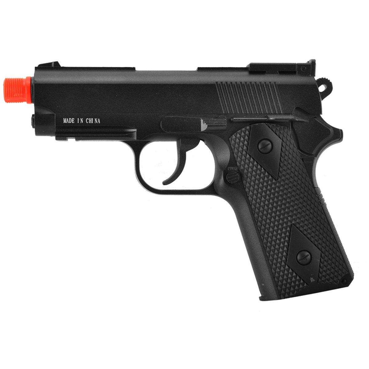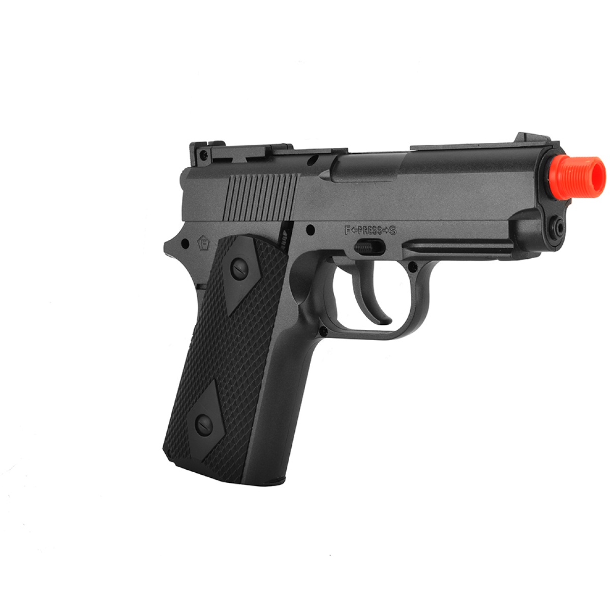 If you’re looking for an airsoft pistol, don’t settle for cheap spring-powered airsoft guns. The Well G291 M1911 CO2 Airsoft Pistol features a full metal build and shoots up to 450 FPS (w/ 0.20g BBs), making it one of the most powerful airsoft guns under $50! While this 1911 airsoft gun does not have blowback action, the lack of blowback plus the CO2 system sets you up with more power to be used in muzzle velocity output, giving you the perfect airsoft repeater for target shooting. The front and rear sights are available for acquiring your targets, but thanks to a built-in accessory rail, you can mount tactical flashlights and red/green laser sights. On top of it all, this Well airsoft pistol has a threaded 14mm (CCW) orange tip for screwing on mock suppressors/silencers. Additionally, the quick-load CO2 system is compatible with standard 12g CO2 cartridges and a spring-loaded, integrated ammo compartment holds up to 12 BBs, eliminating the need to use a separate magazine!