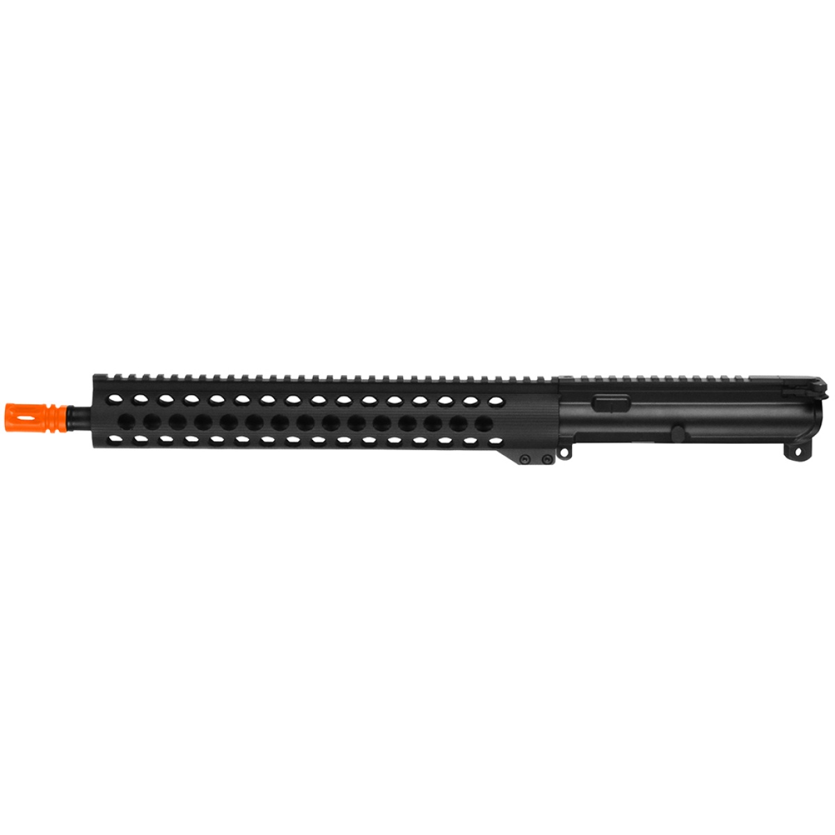 This 13" Polymer Upper Receiver by Golden Eagle is licensed by Troy Industries and is based on their renowned Troy Alpha Rail system. The reduced length of the barrel makes this an ideal platform for CQB applications, and the modular RIS platform can accept a large number of accessories to improve your efficiency. The flat-top receiver has a long monolithic Picatinny top rail that is ideal for mounting a variety accessories like reflex optics, combat sights, or PEQ boxes. A two-piece polymer hop-up system ensures accuracy and is directly compatible with all Golden Eagle polymer lower receiver hop-up chambers.