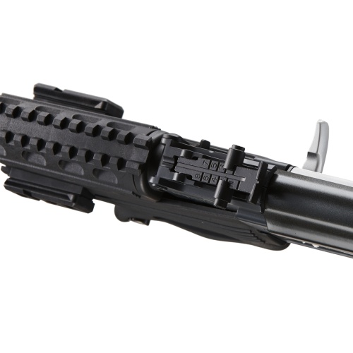 One of the most prominent features of the CYMA AK47M is the inclusion of two RIS rail sections on the top and bottom of the handguard. This feature alone makes this AK47 variant adaptable and modular, giving you the ability to attach any Picatinny RIS compatible accessories, like vertical grips and red dot sights, to augment and refine your strategy on the airsoft battlefield. Furthermore, the sights on this airsoft gun are fully adjustable for windage and elevation so you can adapt to any situation with intensely accurate fire. A full metal Version 3 gearbox provides the power necessary to achieve the high FPS and high rate of fire that this gun cranks out. With 0.20g BBs, our chrono clocked the muzzle velocity of this AEG consistently above 375 FPS and a few shots even clocked in slightly above 400 FPS.