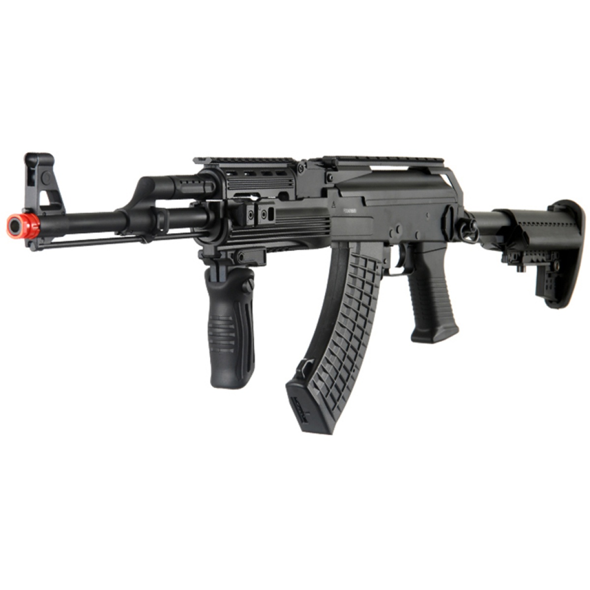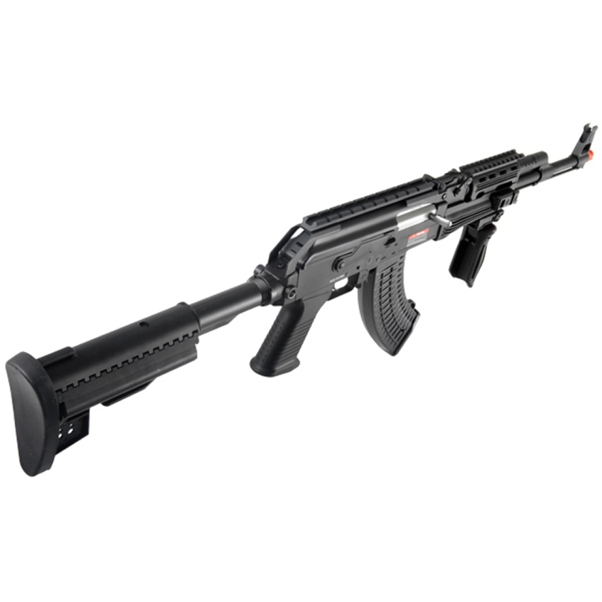 JG's AK-47 Tactical Combat Weapon w/ built in RAS and retractable clubfoot mod stock is a marvel to behold, both visually and mechanically. The technological advances made on this gun do not stop at the exterior; when opened up, you will see JG's best R&D work in the form of the enhanced V3 AK mechbox paired to the newest version of their ultra high-torque motor. The rifle chronographs at 395-445 FPS using 0.20g seamless BBs, and tops out at 453 FPS! The gearbox works seamlessly with the motor to deliver powerful shots that maintain both high muzzle velocity AND stunning accuracy, even from far distances. A full metal barrel also compliments in the delivery of this rifle's powerful and accurate shots.