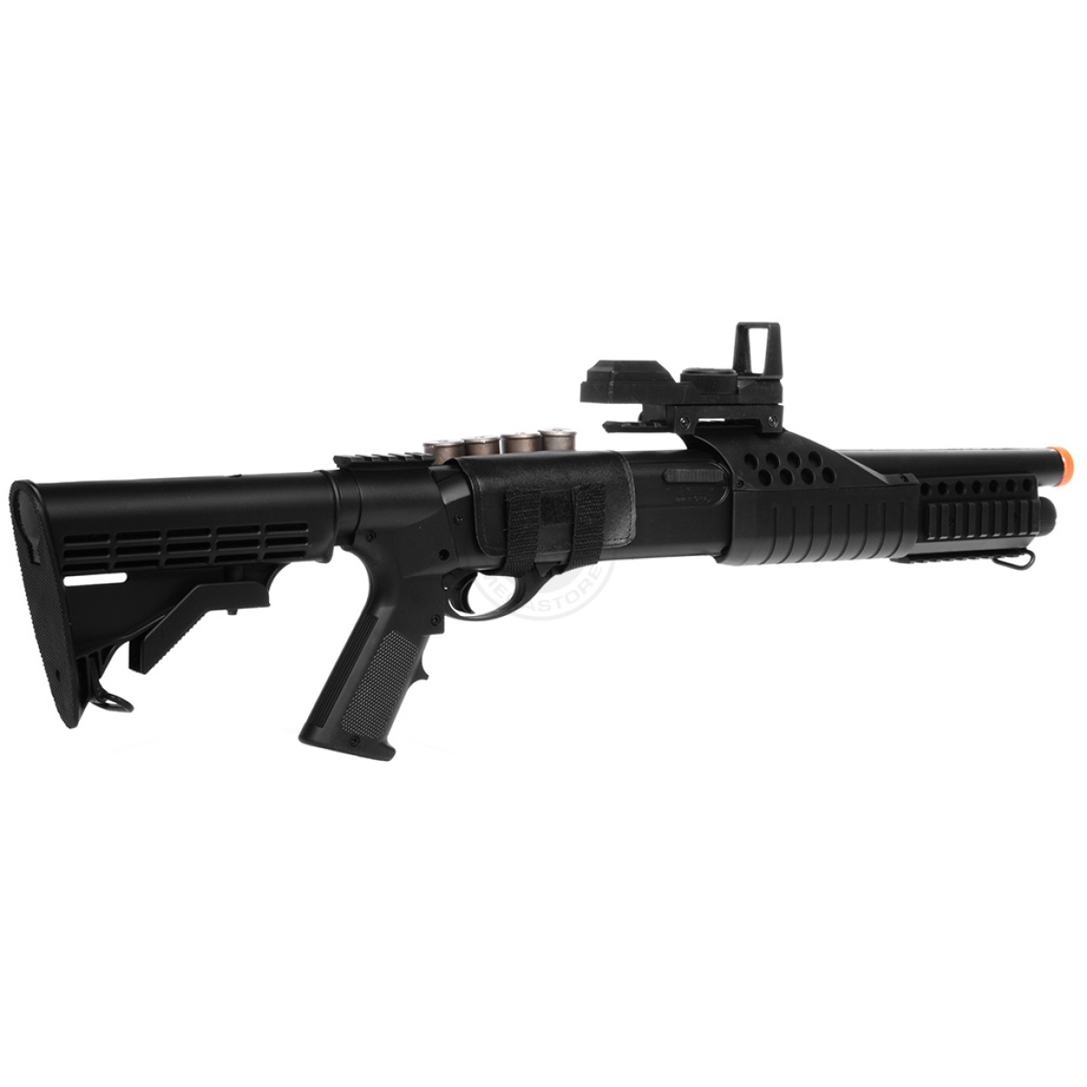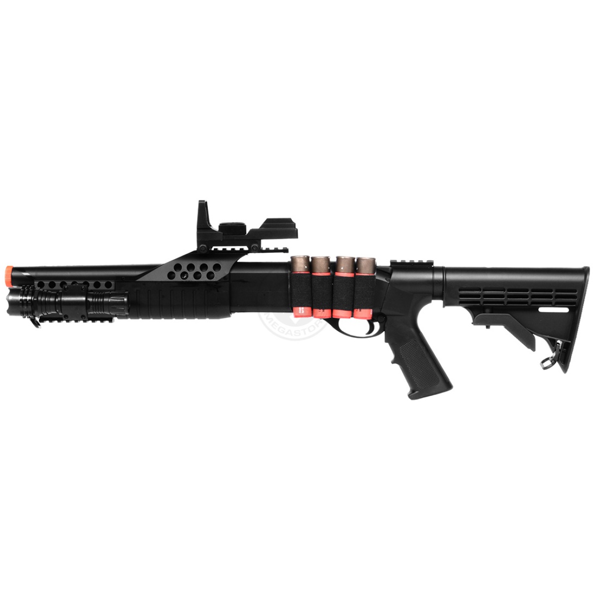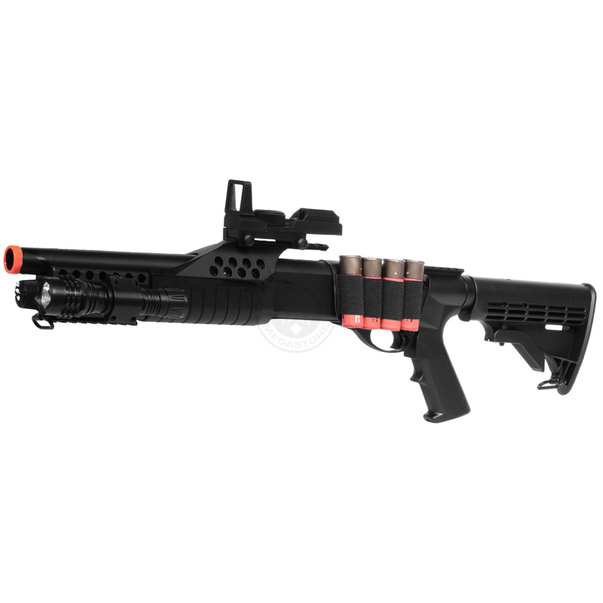 Our take: The M180C2 retractable stock shotgun is a realistic replica of a sawed off shotgun as it is shell fed, just like the real thing. It has a nice weight to it and shoots quite hard at 300 FPS+. This package also comes with the tactical flashlight unit, which helps to illuminate your path in adverse lighting conditions.