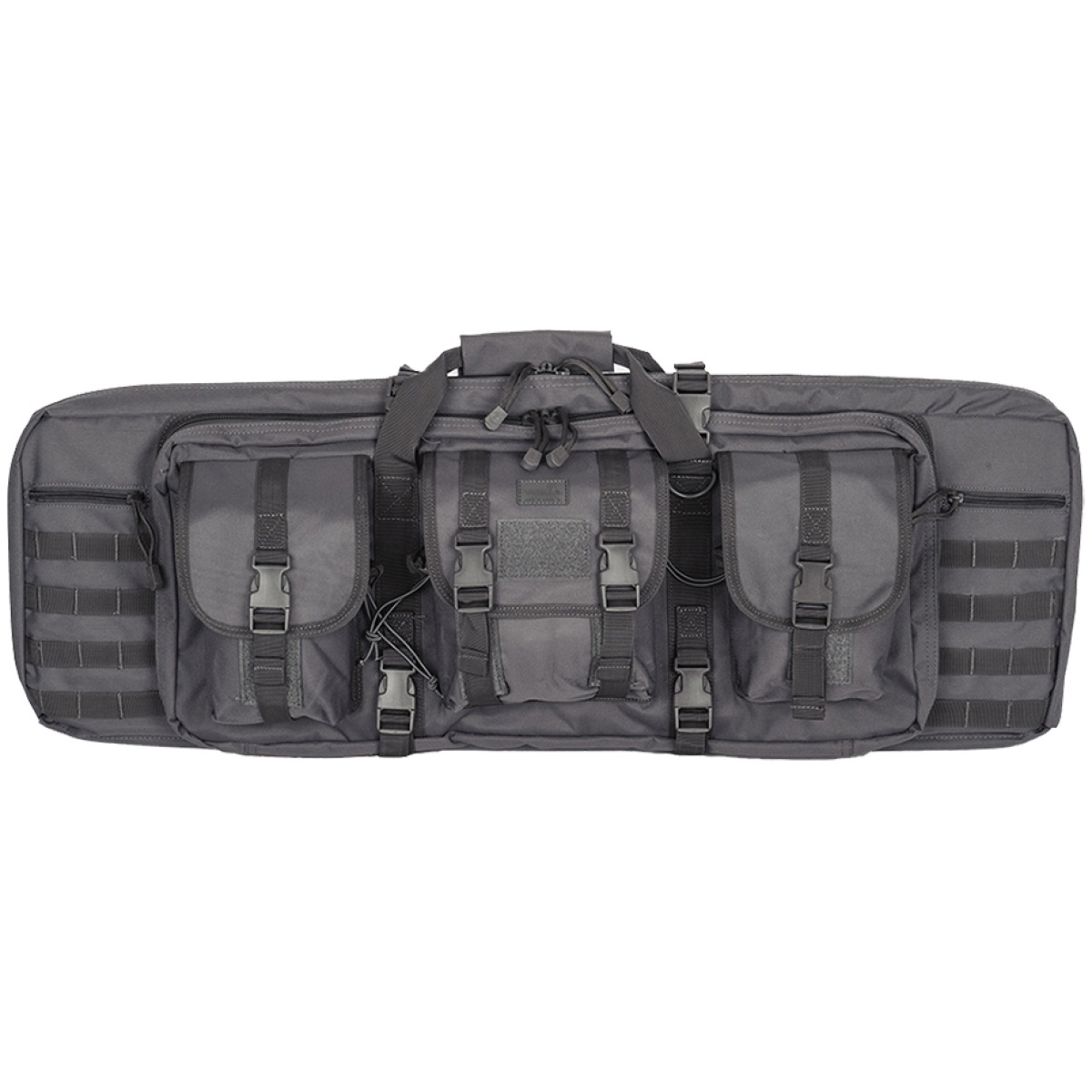 Equipped with 4 lines of MOLLE Webbing, the side compartments are capable to attach a multitude of pouches or patches for customization. The top and bottom external pockets have a secure buckle strap security on each side. Another key component to this gun bag features the second pouch base that cones two zippered inner placements and hook & loop inner closures.