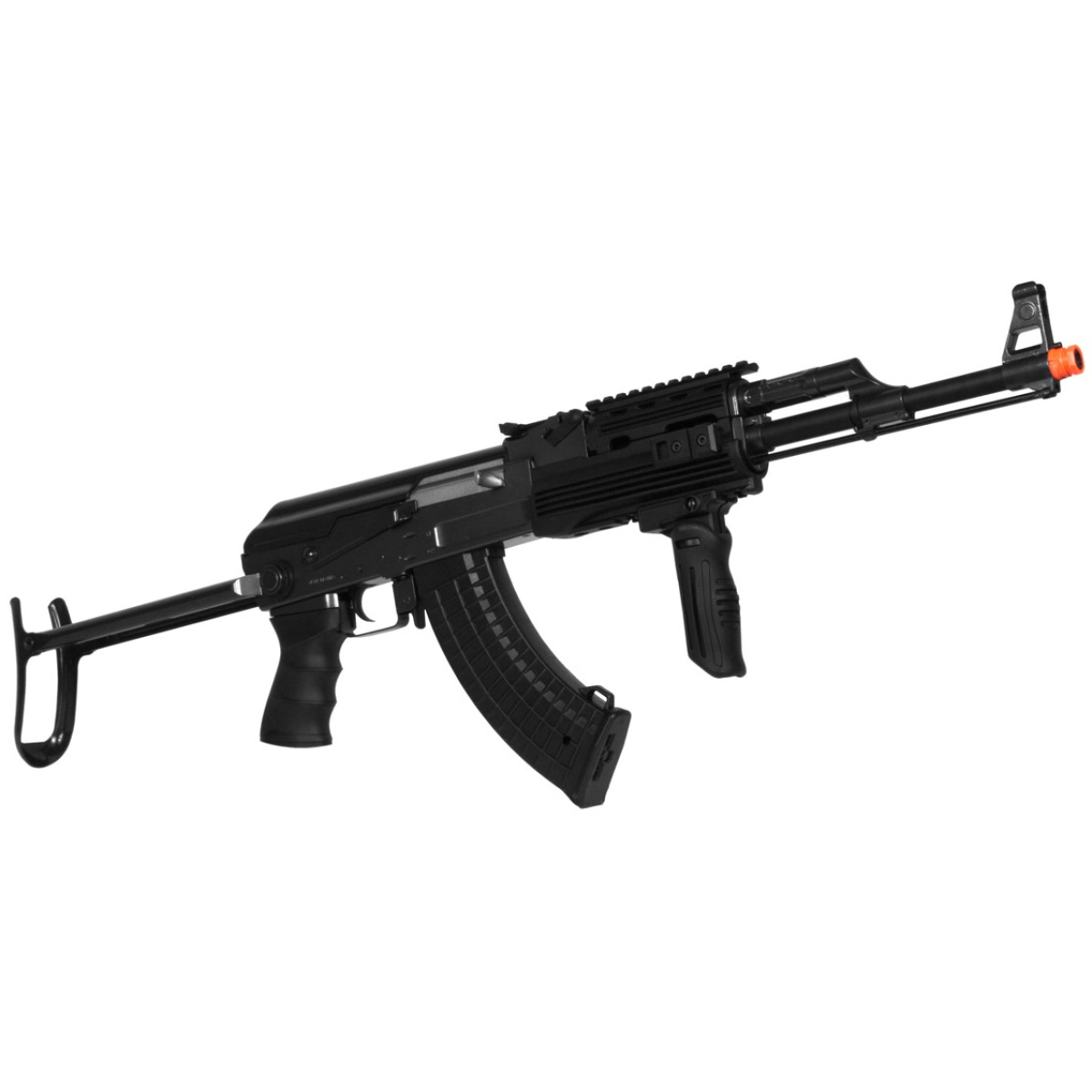 It remains to be one of the most durable and versatile AEGs that JG manufactures for under $150, and features reinforced internals for model year 2012 along with a slightly tighter bore barrel (down by approx. 0.01mm), to further improve upon both durability and accuracy. It holds an excellent balance between power, accuracy, and reliability like many of the more expensive AEGs out on the market, but just without the big price tags to match. We have chronograph verified this to shoot an average of 360-410 FPS with 0.20g BBs; the lowest shot we tested was chrono'ed at 353 FPS with 0.20g BBs and the highest clocked in at 414 FPS with 0.20g BBs. Other features include adjustable hop up, adjustable sights and of course, a metal rear folding/adjustable stock. With full aftermarket/OEM parts compatibility, this AEG can be easily customized and upgraded. The rail system further adds onto the upgrade potential of this gun, since you can add an almost endless amount of tactical accessories to it, including flashlights, scopes, lasers, and grenade launchers.