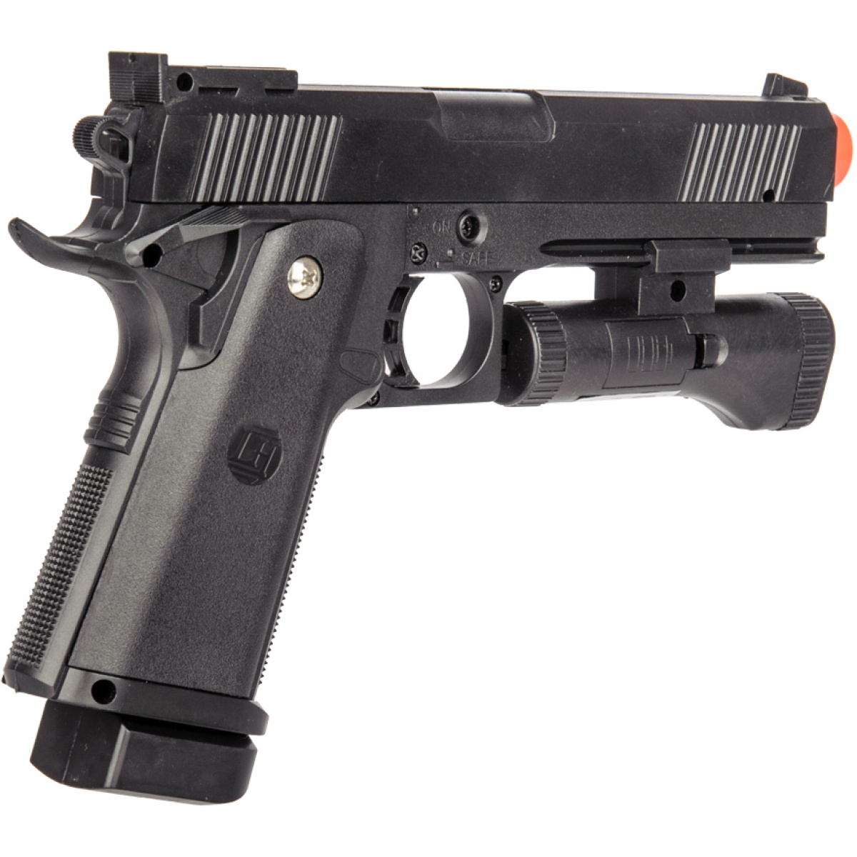 Spring into action with a 1911 replica! This airsoft pistol from UK Arms boasts a spring operated system, a faux beaver tail safety, front and rear sights to ensure your aim is true, and a custom trigger for a fresh design. The tough polymer material gives a nice feel for use in film, theater, or a close target.