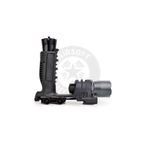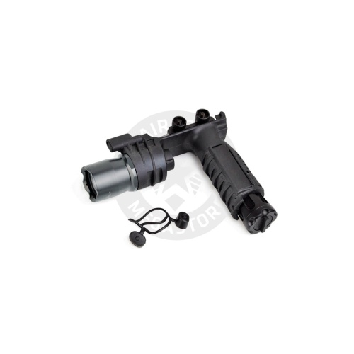 The J-Rich Tactical G910 foregrip flashlight, with a high-intensity xenon bulb system, is a high-quality, low-priced premium-grade flashlight for all Airsoft players. The G910 flashlight is a thoughtfully designed, xenon-bulb equipped lighting system that is integrated into a a vertical foregrip for versatility. Two pressure pads are integrated into the foregrip for instantaneous on/off response. A permanent on/off rocker switch is also present behind the light, for constant on/off light control. Made out of a high-impact ABS polymer and metal, the flashlight is extremely durable and sturdy, but careful attention was paid to minimize weight as to maximize performance efficiency without being bulky.