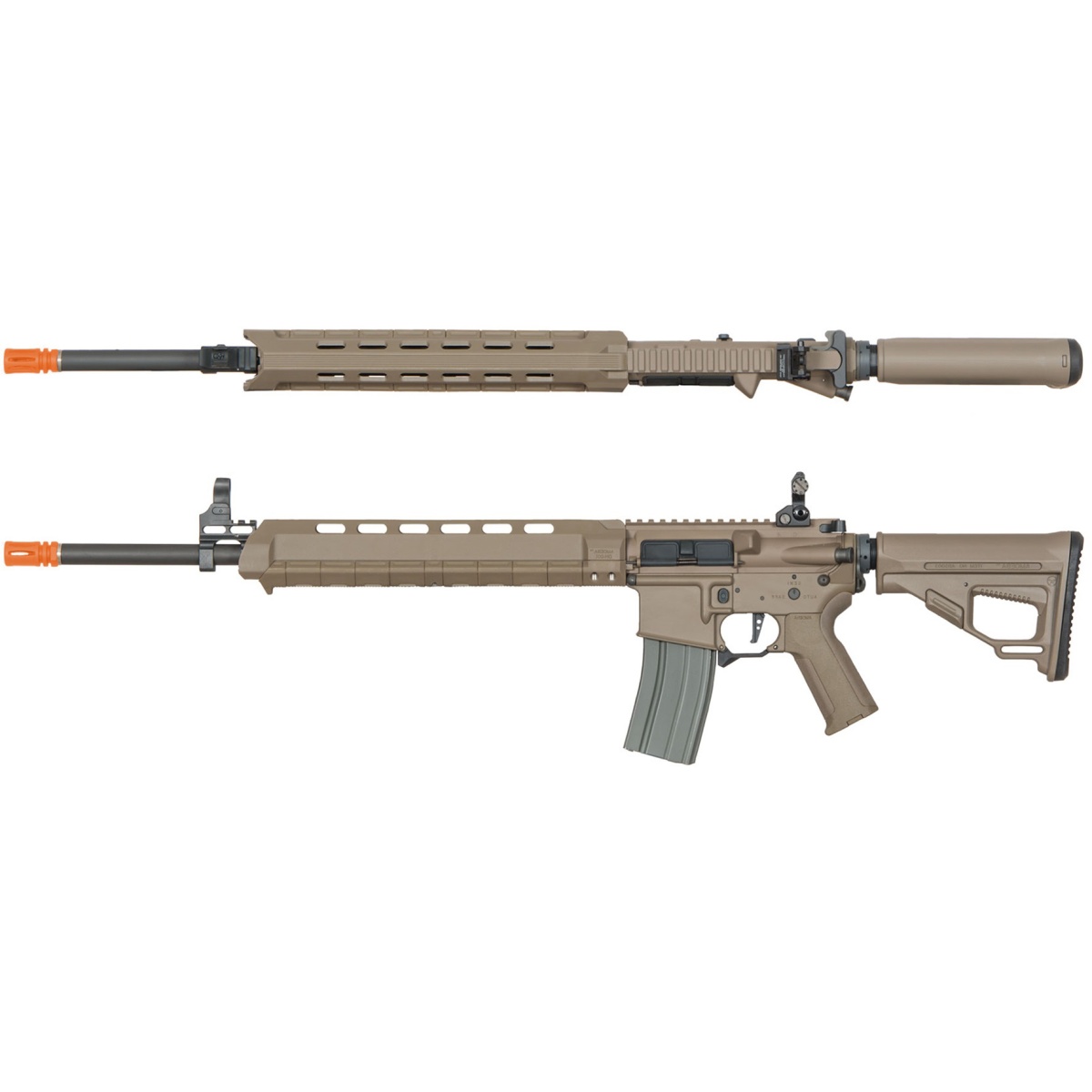 The ARES Airsoft M4 X Standard Long AEG Rifle is a great quality AEG built with their new polymer modular handguard system. This new part is slotted on the lower half and its held tightly with two metals rails that can hold attachable lasers or flashlights. The X has adjustable front and rear sights that enable you to fire with more confidence as you can better pinpoint your target and make more accurate shots. The ergonomic grip and magazine gives your rifle better stability and makes your reload easier. The Pro Tactical adjustable stock and grip are designed to give the right amount of balance and comfort to your leisure. The top rail is made to attach your favorite scopes or sights of your choosing. A quick change spring system enables you to meet certain mil-sim requirements or simply change your muzzle velocity without removing your gearbox. In addition to the series, this AEG in particular provides backup iron sights, extended trigger guard, rear sling mount position, and a flat speed trigger.
