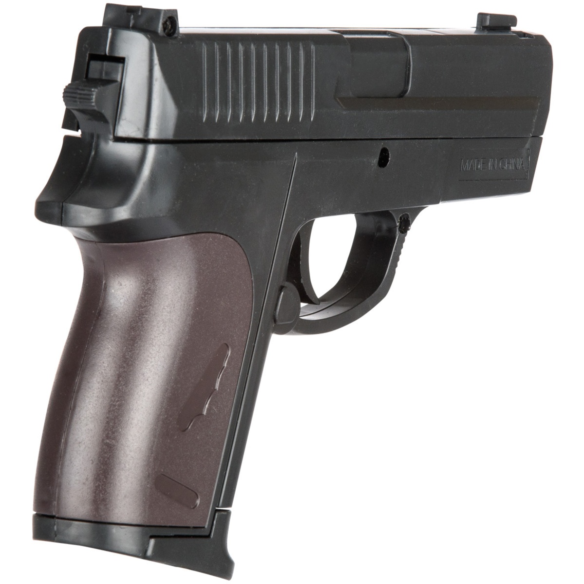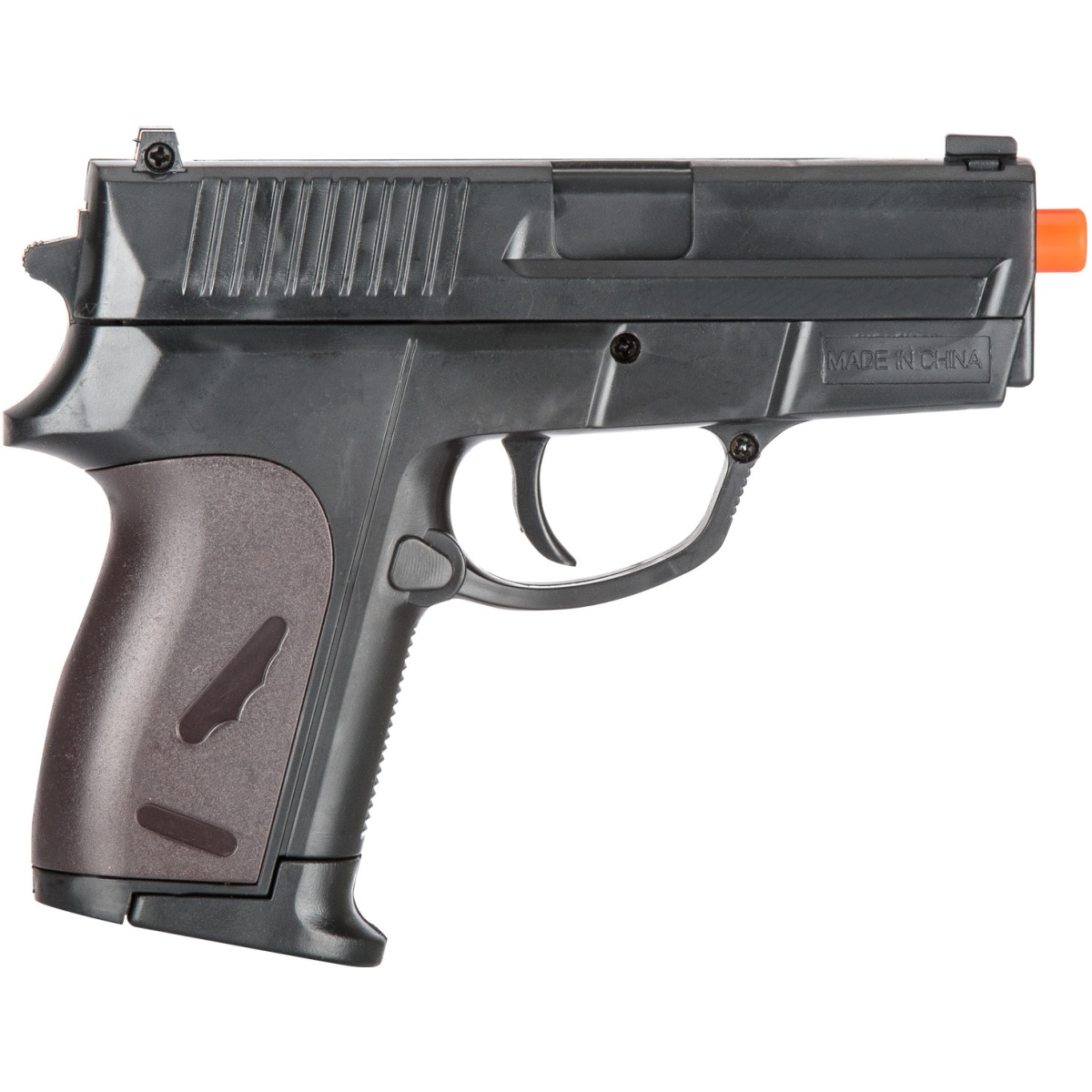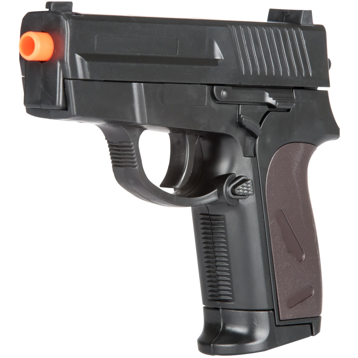 Whether reenacting a scene or getting some close range target practice, the P618BAG Spring Loaded Pistol is an inexpensive choice with a nice look. This airsoft gun shoots 6mm BBs and works by pulling back on the pistol's slide. It is definitely not capable of being used during an airsoft match, but may be used for a mock battle. This pistol comes along with a bag of BBs to have some close range target shooting as soon as you open it! Though it isn't capable of airsoft matches, this gun can be a lot of fun in the right hands.