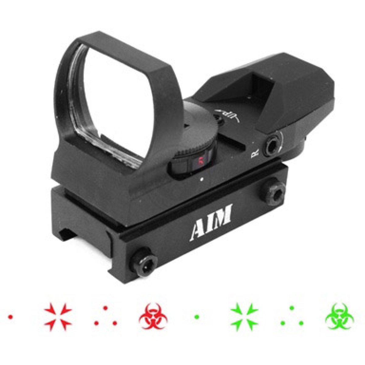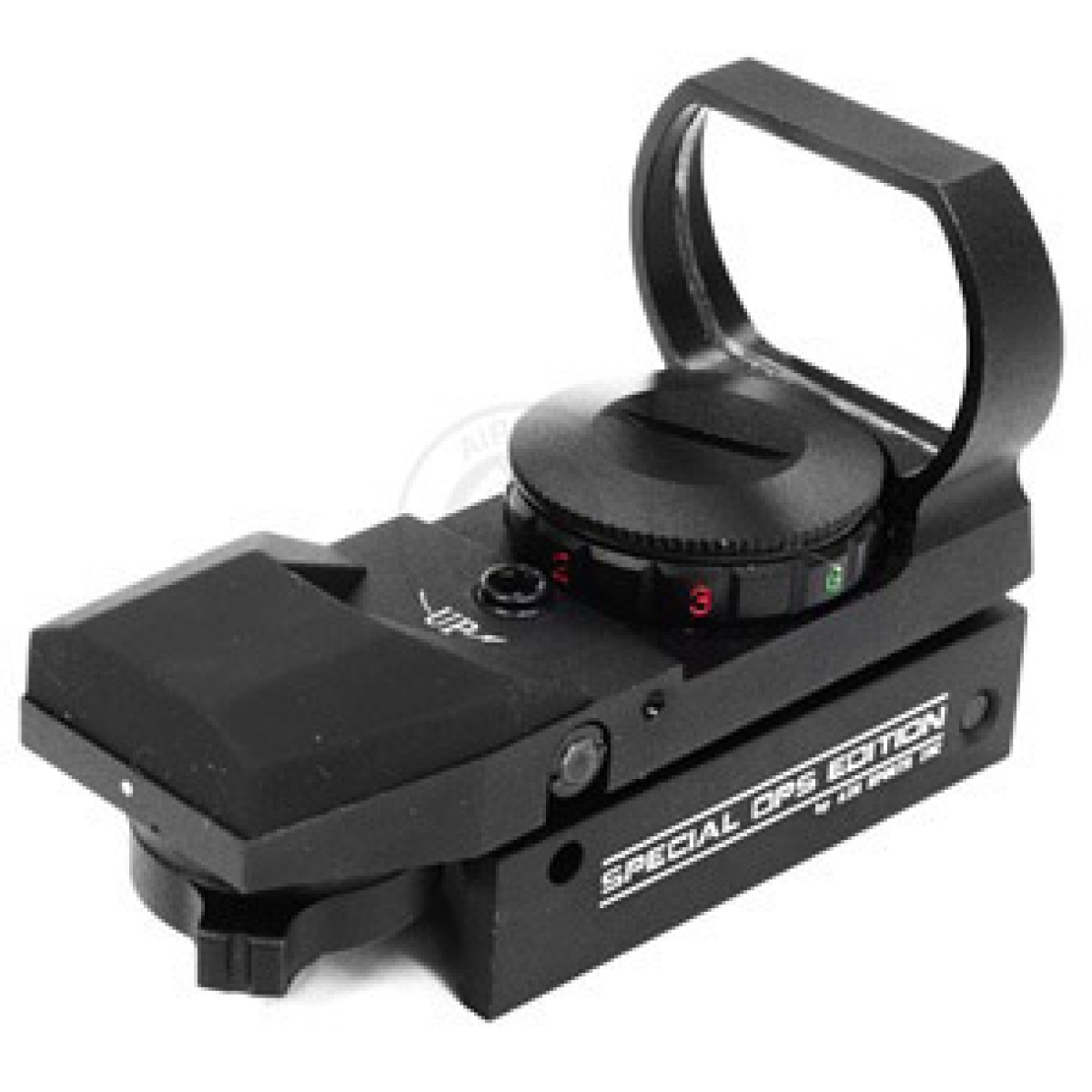 The AIM Sports Special Ops Edition Tactical Dual Illuminated Red Dot Sight unit features four different aiming reticles giving you a truly unique and customized sight picture. The Special Ops Edition Red Dot also features three different brightness levels, suitable for any lighting environment. This Red Dot sight is constructed entirely of high grade aluminum, providing added durability as well as a serious tactical look. This AIM Sports Special Ops Edition red dot sight is designed for ultra-fast target acquisition, quickly painting your targets with a bright dot reticle and keeping you on target! This Red Dot sight is extremely useful as a stand-alone optic due to its compact size and the crisp clarity of the red dot. The reticles of this Red Dot sight are based on reticles from video games, making your airsoft games seem like you playing in your favorite first person shooter video game!