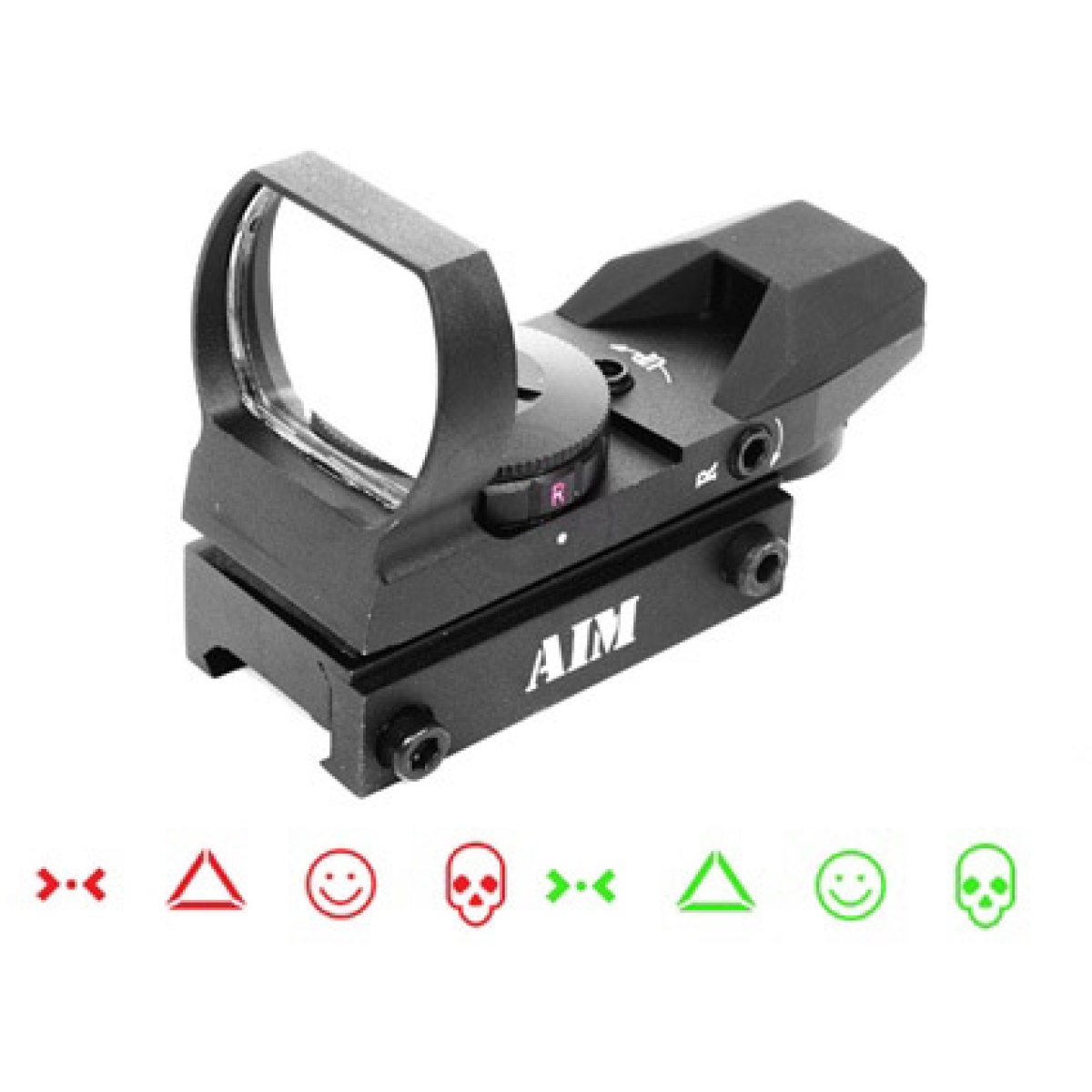 The AIM Sports Warfare Edition Tactical Dual Illuminated Red Dot Sight unit features four different aiming reticles giving you a truly unique and customized sight picture. The Warfare Edition Red Dot also features three different brightness levels, suitable for any lighting environment. This Red Dot sight is constructed entirely of high grade aluminum, providing added durability as well as a serious tactical look. This AIM Sports Warfare Edition red dot sight is designed for ultra-fast target acquisition, quickly painting your targets with a bright dot reticle and keeping you on target! This Red Dot sight is extremely useful as a stand-alone optic due to its compact size and the crisp clarity of the red dot. The reticles of this Red Dot sight are based on reticles from video games, making your airsoft games seem like you playing in your favorite first person shooter video game!