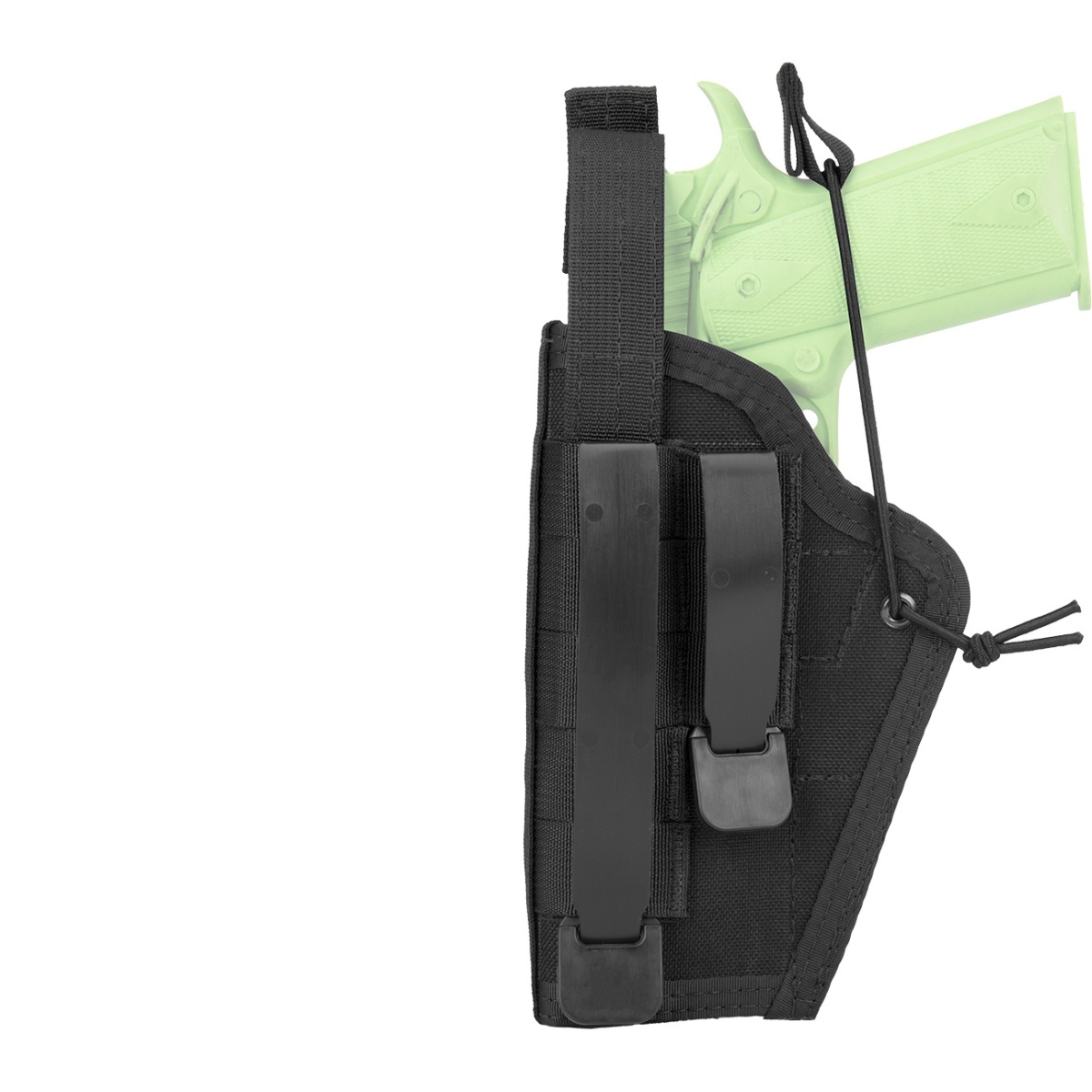 This PALS-mountable, 1000D Cordura nylon holster was designed to work with most medium frame semi-automatic handguns. Designed for all shooters, it features a removable bungee retention tab and adjustable thumb break, which can be configured for ambidextrous use. This holster may not be compatible with aftermarket attachments. It includes one long and one short HSGI Clip for attachment to PALS. MOLLE webbing on the front and back allows the holster to be attached on either side, perfect for both left and right-handed shooters.