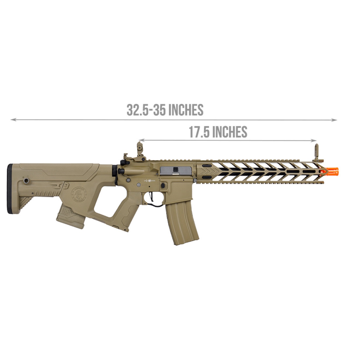 The 6.03 stock tightbore barrel further increases range and FPS, and an injected polymer rotary style hop-up adjusts BB spin effortlessly for maximum precision. Upgraded with an 18:1 reinforced steel gear set to provide a quicker cycling rate and 8mm bushings to enhance the operational smoothness of your gears. These upgraded internals increase shot to shot consistency with minimal wear to your internals. The powerful 25k high torque motor is regulated to maximum efficiency with low resistance copper wiring and a bonus battery protection feature! When low voltage is detected from a drained battery, an automatic cut off keeps equipped batteries from draining completely, vastly increasing battery life and longevity. Replace your springs and alter your FPS without opening up your gearbox! A true quick change spring system enables adjustment from CQB to outdoor and back through unlocking the mechanism secured inside the buffer tube.