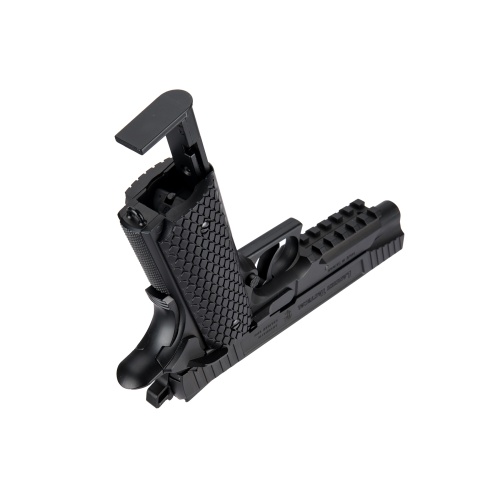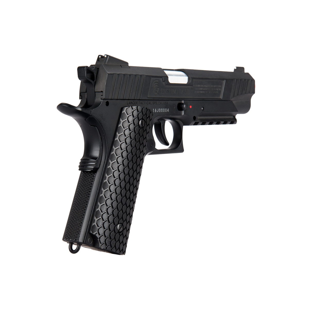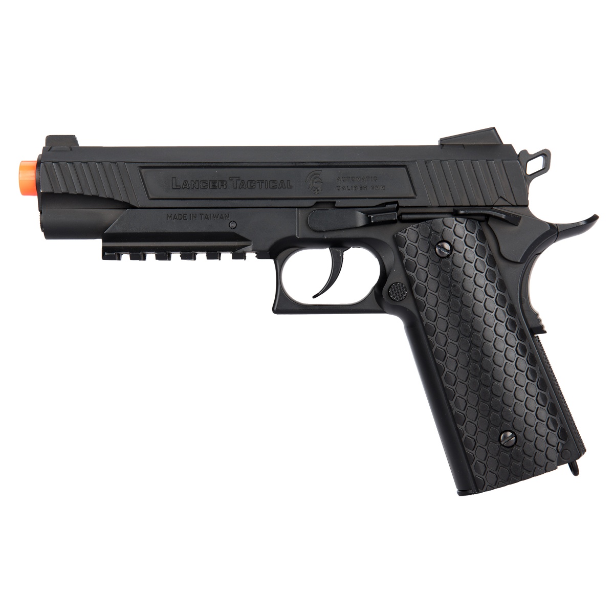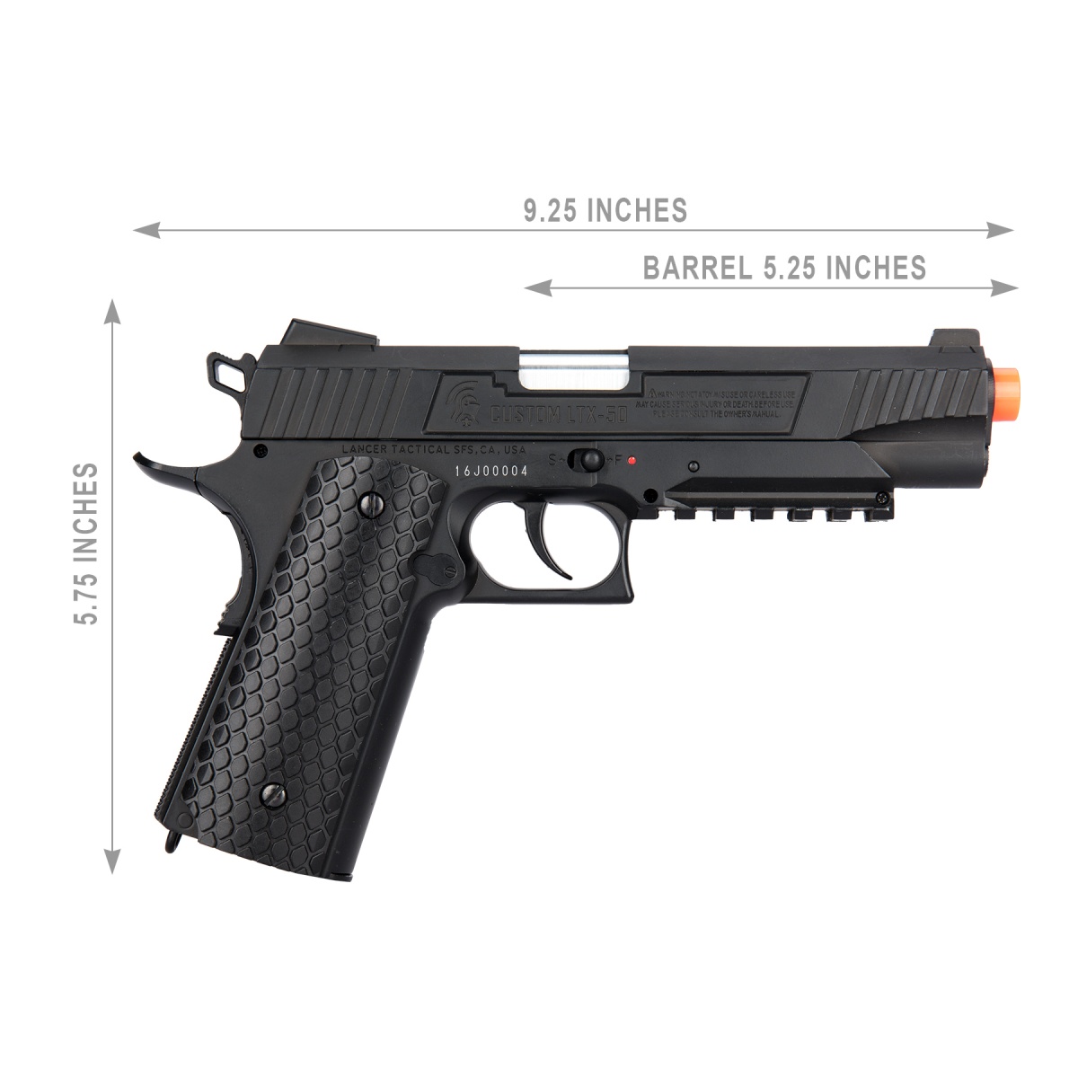 The Lancer Tactical Cobra LTX-50 1911 CO2 Half-Blowback Airsoft Pistol in black delivers the perfect blend of classic 1911 styling with modern enhancements, making it a reliable and affordable sidearm for airsoft players of all skill levels. Built with a durable metal slide, frame, and sights combined with polymer grip panels and an integrated rail, this pistol is both sturdy and lightweight at only 1.94 pounds. Powered by a standard 12g CO2 cartridge that fits directly inside the magwell, it produces consistent muzzle velocities between 310 and 340 FPS with 0.20g BBs, giving players reliable performance during close quarters skirmishes and outdoor play. Measuring 9 inches in length, the pistol maintains a balanced profile that is easy to carry and quick to draw when you need a dependable backup weapon on the field. This 1911 replica is designed with practical features that enhance both realism and usability. The three white dot combat sights make target acquisition fast and precise, while the non-slip scaled pistol grip panels ensure control even in high intensity matches. Front and rear slide serrations make it easy to operate, and the half-blowback system provides recoil realism without excessive gas usage, making it efficient and effective. A double action trigger delivers a long, smooth pull, and the blowback action locks the slide back once the magazine is empty for authentic handling. The pistol's 15 round strip style magazine may be compact, but its ease of loading makes it an excellent fit for fast paced play. With an integrated accessory rail for lights or lasers and a lanyard loop for retention systems, the Lancer Tactical Cobra LTX-50 1911 CO2 pistol is a versatile sidearm built for performance, reliability, and realism, making it a smart choice for airsoft enthusiasts.