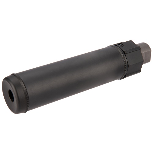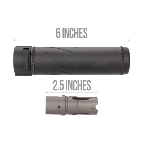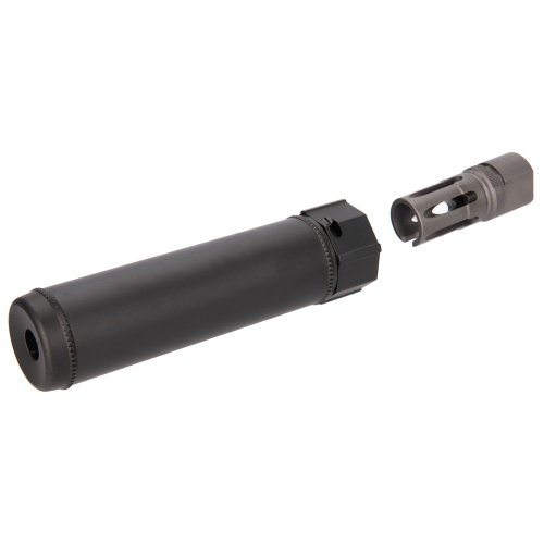 The 5KU SOCOM Series QD Airsoft Mock Suppressor fits airsoft rifles with 14mm counter-clockwise (CCW) threading and comes with a bird cage style flash hider with extender. This suppressor and flash hider combo, which is built of durable aluminum alloy, is a great upgrade part especially for longer, rifle-length airsoft guns especially if you decide to run a longer inner barrel with your outer barrel to increase precision. Unlike some other mock suppressors, this one comes with a QD clamp that will allow you you rapidly deploy or ditch it at a moment's notice.