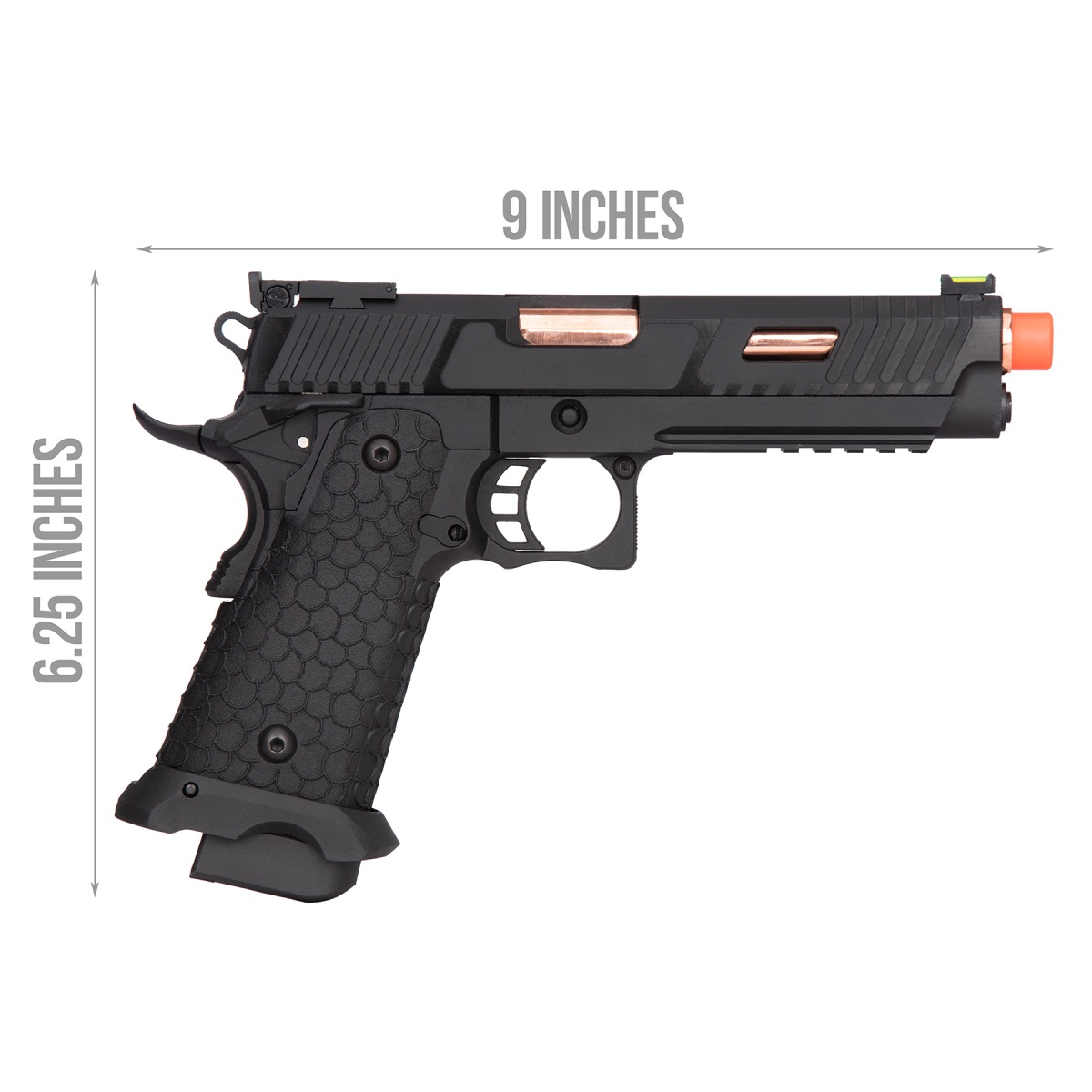 KLI is an airsoft manufacturer based out of Taiwan. They are famous for a variety of OEM projects in the airsoft world. The Baba Yaga 1911 Hi-Capa Series is the next tactical beast to hit the market! With the durable full metal frame and slide, this pistol can take a beating! The stippled texture will give you a perfect grip without wearing gloves. The slide cuts allow you to rack the gun and press check much easier. This paired with the window cuts lighten the slide and increases the cycle rate. The Fiber Optic front sight makes for quicker target acquisition and the flared magwell assists with faster reloading. The five slot picatinny rail is cut into the frame and is able to mount a plethora of flashlight and lasers onto the sturdy frame. This pistol is left had friendly with the ambidextrous safety switch. Not to mention that this pistol is mostly Tokyo Marui compatible, which means you can upgrade this pistol with the wide variety of aftermarket parts available! This Green Gas model is shooting roughly between 300-330 FPS and is perfect for CQB gameplay. This is the Hi-Capa of your dreams, and the Boogeyman of your enemies' nightmares!