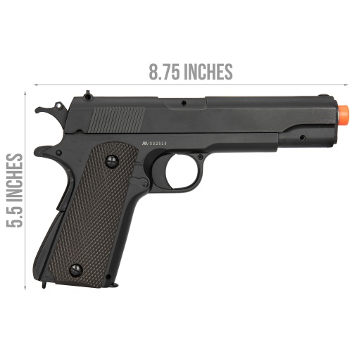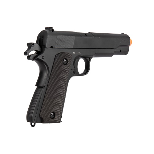 The Double Bell M1911A1 Metal Body Airsoft Spring Pistol in black is a reliable and affordable entry-level sidearm modeled after one of the most iconic pistols in history. Built with a full metal slide and frame, this spring-powered pistol provides durability and a realistic feel in hand while staying budget-friendly for beginners and casual players. Firing at 175-185 FPS with 0.12g BBs, it offers a safe yet fun shooting experience for backyard plinking, target practice, or close-range skirmishes. The pistol operates on a simple single-shot, spring-powered mechanism, making it easy to use without the need for gas or batteries. Its 14-round magazine, compatible with DB-601J mags, ensures quick reloads, while the faux hammer locks back when the slide is racked, adding an extra layer of realism. Measuring 8.75 inches in length and weighing comfortably in hand, the M1911A1 captures the size and proportions of the real firearm, making it a great replica for training or display as well as play. Designed with both realism and usability in mind, the Double Bell M1911A1 includes serrated slide cuts for improved grip and textured polymer grips for added handling comfort during extended use. The built-in lanyard loop allows secure carry options, while the included cleaning rod helps maintain the pistol's performance over time. As an officially styled 1911A1 replica, this pistol delivers a classic look and practical function, ideal for collectors, casual shooters, or players looking for a dependable spring-powered sidearm. Its all-metal construction not only boosts durability but also gives the pistol an authentic weight that stands out among other budget-friendly options. With its combination of affordability, realism, and functionality, the Double Bell M1911A1 is a solid choice for those looking to add a spring-powered 1911 to their airsoft collection.