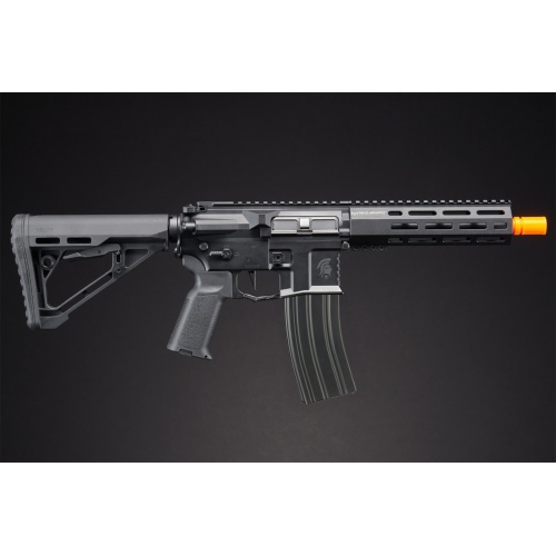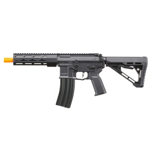 The Lancer Tactical Gen 4 Predator SBR AEG with PTS Rail System and Nebula II ETU in black is a battle-ready rifle designed for advanced performance and tactical customization. Built from high-strength metal alloy, this AEG features a billet-style receiver with a matte black finish for durability and sleek aesthetics. Its standout feature is the fully licensed Griffin Armament handguard, offering seven sides of M-LOK compatibility and a full-length 1913 Picatinny top rail. Designed to accept silencers up to 1.5 inches in diameter, this platform gives you serious flexibility for mounting optics, foregrips, lights, and suppressors. The rifle is equipped with a 6.03mm tight bore inner barrel, rotary hop-up chamber, and upgraded low-profile PTS gas block and gas tube, ensuring consistent accuracy and range on the field. Internally, the Gen 4 Predator is powered by Lancer Tactical's Nebula 2 ETU, a programmable MOSFET system that delivers responsive trigger performance, protection, and firing mode options. Clocking in at 380-400 FPS, the 290mm inner barrel makes it ideal for close quarters and medium-range engagements. The rifle also includes ambidextrous fire controls, charging handle, and a functioning bolt catch for a realistic feel. The Delta stock with a rubberized buttpad enhances comfort and stability, while the quick-change spring system and Deans connector make maintenance and upgrades hassle-free. Rounding out the build are flip-up Faxon iron sights and a 140-round high-speed mid-cap magazine. Whether you're looking to dominate on the airsoft field or upgrade your kit with cutting-edge components, the Lancer Tactical Gen 4 Predator 10" SBR is a high-performance choice built to keep up with aggressive playstyles. Available now and ready for action.