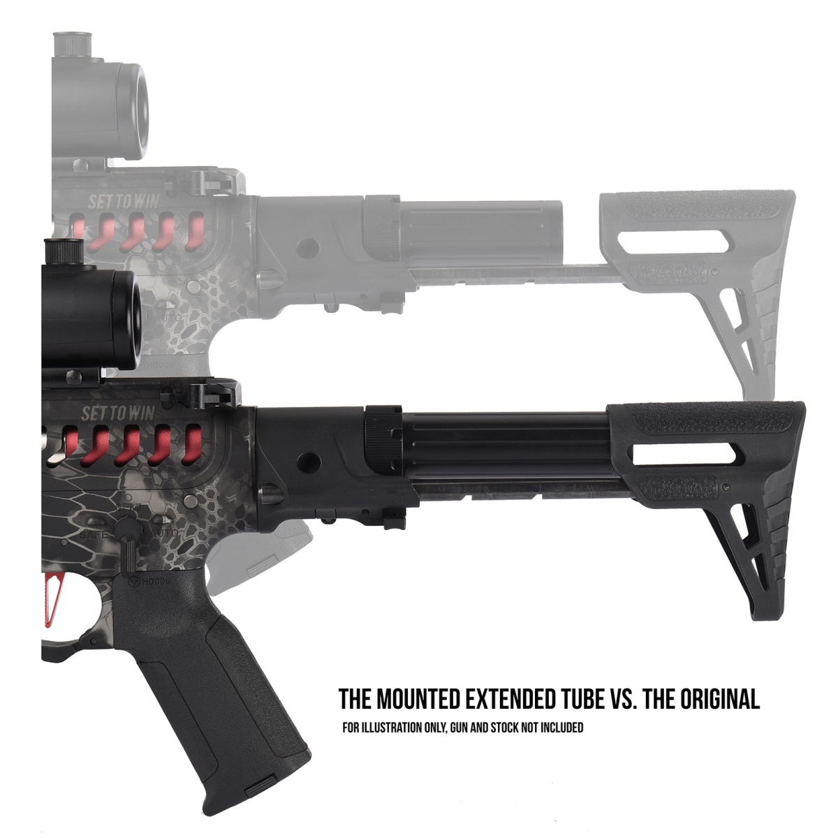 Lancer Tactical PDW extended buffer tube that is a direct replacement for the original buffer tube. This buffer tube is 5 inches long which allows for much bigger or longer batteries to be fitted inside the buffer tube.