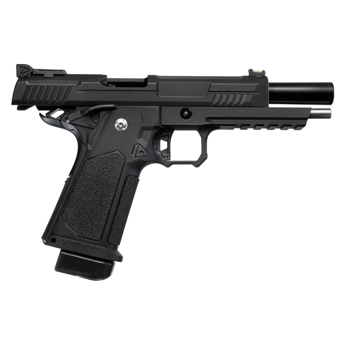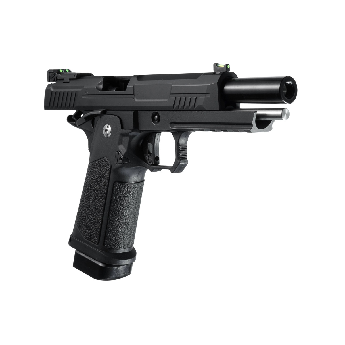 The ARCTURUS Vanguard 5 inch Hi Capa GBB Pistol in black is a performance-driven gas blowback sidearm built for airsoft players who demand reliability, precision, and upgrade potential. Featuring a full metal slide with integrated fiber sights, this pistol delivers a crisp sight picture and realistic cycling action with every shot. Its refined internals are precision engineered to provide consistent power output, enhanced gas efficiency, and excellent accuracy. The long 5 inch configuration improves stability and range, making this pistol a strong contender for both CQB and mid-range engagements. Firing up to 1.0 joule depending on gas and BB weight, it offers a strong combination of speed and control right out of the box. Constructed from high-grade MIM steel and reinforced nylon fiber, the Vanguard 5 is built to endure harsh field conditions while remaining lightweight and comfortable to handle. Ten key internal components are reinforced with steel for added durability, ensuring long-term performance under repeated use. The stippled grip is molded from high-strength polymer for superior handling, while the ambidextrous magazine release makes the platform user-friendly for both left- and right-handed shooters. Its magazine features SEFP reinforced components, increasing resistance to drops and wear. With a 30 round capacity and full compatibility with standard Hi Capa upgrade parts, this pistol is a great option for players seeking a rugged, modular GBB platform with serious potential. Whether used as a primary in CQB or a reliable sidearm in outdoor matches, the Vanguard 5 inch Hi Capa stands out with its balance of power, durability, and modern design.
