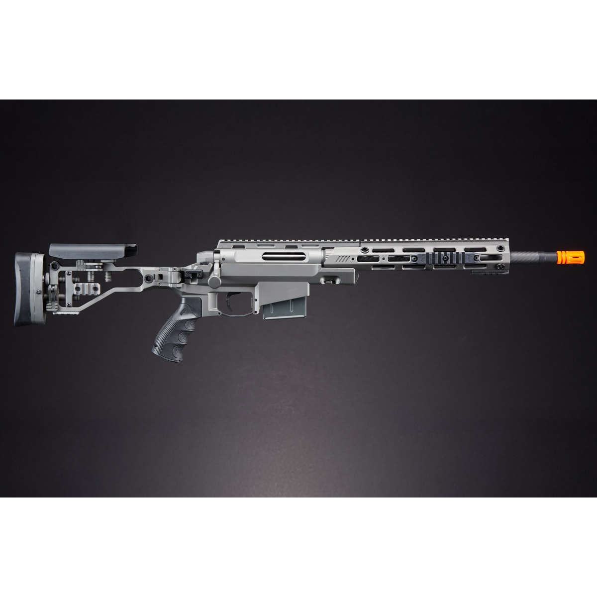 This model comes with a heavy-duty polymer carrying case that includes multiple compartments to securely store each part of the rifle, ensuring it remains protected during transport. The fully adjustable folding sniper stock features a cheek pad and rubber butt pad for comfort, QD sling points for easy carry, and even a small Picatinny section for monopod attachment. The folding pistol grip adds to its compact stowage capabilities, while the full-length 20mm Picatinny top rail offers plenty of space for scopes or additional accessories. The MSR303 includes a 45-round steel-cased magazine and an adjustable hop-up for fine-tuning shot trajectory. Its 14mm positive thread allows for the addition of muzzle devices or suppressors. With its combination of quick assembly, robust construction, and customizable features, the ARES MSR303 Quick-Takedown Airsoft Sniper Rifle stands out as a top-tier choice for players seeking a professional-grade, competition-ready sniper rifle that can adapt to any field scenario. This rifle is engineered for precision shooters who value high performance, portability, and tactical adaptability on the battlefield.