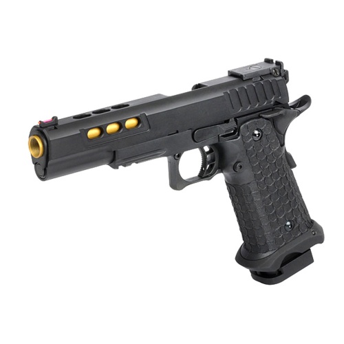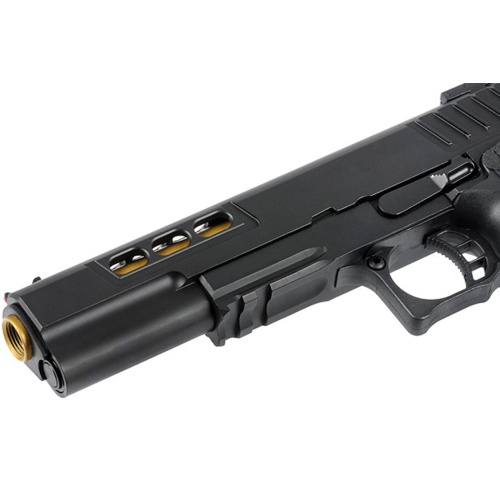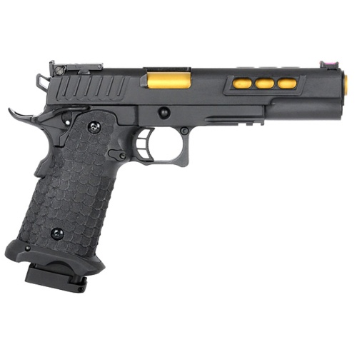 The Army Armament R608 Hi Capa Gas Blowback Airsoft Pistol with Gold Barrel in black combines performance, realism, and style in a highly reliable sidearm built for competitive and tactical airsoft players. Featuring a full metal slide with a polymer frame, this pistol offers excellent durability while maintaining a balanced and comfortable weight for extended gameplay. Powered by green gas, the R608 delivers a consistent muzzle velocity between 320 and 350 FPS with each shot, giving it the punch and precision needed for field and CQB environments. The gas blowback system provides realistic slide cycling that closely mimics the function of a real firearm, enhancing immersion and control. The adjustable hop up system allows players to fine tune accuracy for different BB weights and engagement ranges, while the 28 round magazine ensures reliable feeding during intense matches. Visually striking and functional, the R608 features vented slide cutouts that reveal its polished gold outer barrel, adding a custom competition look while also reducing slide weight for better gas efficiency. The scape textured grip enhances control and stability even when wearing gloves, and rear slide serrations allow smooth racking under pressure. A beavertail grip safety provides added security, and the skeletonized competition style trigger offers a smooth, crisp pull that minimizes fatigue during rapid fire sessions. Equipped with fiber optic iron sights for fast target acquisition in all lighting conditions, this pistol is built to perform and impress. Compatible with most Hi Capa 5.1 magazines, the Army Armament R608 is an ideal blend of precision, power, and design. Whether used for competition, skirmishes, or training, this Hi Capa pistol stands out as a dependable and visually stunning sidearm for airsoft players seeking both performance and flair.