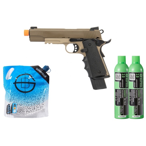 Army Armament R32 gas blowback pistol in tan arrives as a complete green gas combo designed for dependable field performance and easy counter sales. The full metal slide, frame, trigger, slide lock, and magazine release give the sidearm a solid, confident feel, while the polymer grip with texturing and a finger groove insert improves control in all weather. Semiautomatic operation with a substantial recoil impulse keeps training realistic, and an ambidextrous thumb safety supports right or left handed users. Fiber optic sights speed up target acquisition, the integrated frame rail welcomes lights and other accessories, and an adjustable hop up helps tune flight with common outdoor and indoor weights. Performance is dealer friendly and site legal for most fields at roughly 300 to 320 FPS with 0.20 gram BBs. The extended 30 round magazine with base pad and an extended magazine release support faster reloads without breaking grip. Overall length is 9 inches and weight is about 2.3 pounds. This bundle adds Golden Ball 3000 round 0.25 gram ProSlick seamless BBs plus Lancer Tactical 12KG high PSI green gas with silicone oil, giving customers the accuracy, consistency, and reliable fueling they expect from a pro shop purchase. Golden Ball rounds are polished and diameter controlled for smooth feeding and tight grouping, while the Lancer Tactical canister lubricates the system during use and features a durable metal nozzle that resists leaks over its service life. Merchandising the combo as a one box airsoft pistol solution supports faster conversions, fewer returns, and easier upsells on holsters, lights, and spare magazines.