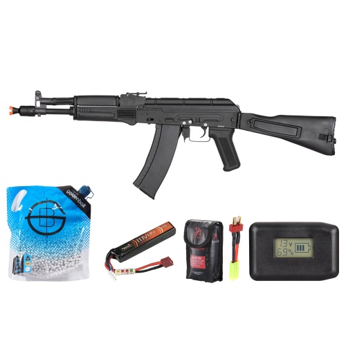 The Double Bell AK 105 Airsoft AEG Rifle with Foldable Stock Battery Adapter Charger Combo Black is a reliable and versatile replica designed for players who want a classic AK platform with modern functionality. Built with a full metal receiver, outer barrel, and top cover paired with durable polymer furniture, this rifle provides a strong, realistic feel while remaining comfortable for extended gameplay. At 6.5 pounds and measuring 23.5 inches folded to 33 inches extended, the AK 105 is adaptable for both close quarters and outdoor scenarios. Internally, it features a full metal version 3 gearbox, adjustable hop up system, and a 500 round high capacity magazine for sustained fire. The oversized trigger guard, adjustable iron sights, and foldable stock enhance both usability and authenticity. Shooting at 300 to 310 FPS with .20g BBs, this AEG is well suited for field play while maintaining durability and performance. For dealers, this bundle delivers excellent value by providing everything a customer needs to be field ready in one convenient package. Alongside the rifle, the set includes a Lancer Tactical LCD universal LiPo balance charger with automatic shutoff for safe charging, a compact Lancer Tactical 11.1v 900mAh LiPo battery with Deans connector for dependable power delivery, and an Intellect adapter cable to ensure compatibility with mini tamiya wiring. To keep players fully supplied, Golden Ball 3000 count 0.25g seamless BBs are included, offering polished consistency and smooth feeding. This all in one bundle not only saves customers money but also makes the buying decision easier, creating strong dealer appeal. Marketed as a complete AK 105 airsoft bundle deal with built in discounts and ready to play convenience, this package is optimized for key search terms like airsoft rifle combo, AEG AK bundle, and complete package savings, helping dealers drive more traffic, boost conversions, and secure repeat sales.