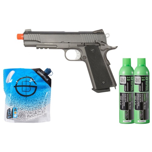 This green gas combo ships with Golden Ball three thousand round zero point two five gram ProSlick seamless BBs engineered for consistent feeding, tight grouping, and dependable range, plus Lancer Tactical twelve kilogram high PSI green gas. Stock one bundle and sell a complete airsoft pistol solution right from the counter. Promote it as a bundle deal, new arrival, limited time pricing, and a huge savings opportunity for retail partners and field shops. The curated package increases basket size, speeds sell through, and keeps customers returning for refills.