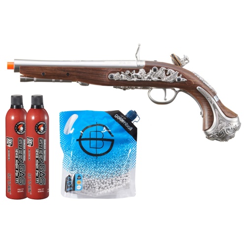 Bring a piece of early American history to your counter with the HFC George Washington Flintlock airsoft pistol Green Gas Combo Silver. Gas powered and single shot this faithful replica pairs a metal barrel assembly with faux wood furniture for convincing heft at about 2.3 pounds and an overall length of 16 inches. The flint lock style action looks and feels authentic so every press is cinematic and satisfying. Performance is smooth at an estimated 290 to 310 feet per second with 0.20 gram BBs and the fixed hop up keeps operation simple and consistent. Quality alloy build keeps it durable. A faux leather powder flask is included to carry BBs and complete the period correct experience. This ready made bundle maximizes value for airsoft dealers seeking bundled deals discounts and huge savings that boost margin and drive airsoft product sales. The combo includes Golden Ball 3000 round 0.25 gram ProSlick seamless BBs engineered for consistent feeding strict diameter control and excellent accuracy grouping and range with minimal jamming. To power the pistol you also get Lancer Tactical 12KG high PSI green gas with silicone oil that lubricates protects internal seals and helps parts resist wear while a durable metal nozzle design reduces leaks. With ammo and gas included your customers can start shooting right away and your store can present a complete solution that increases add to cart rate and in store conversion. Spotlight the combo price to show real savings versus buying items separately then list it under airsoft combo deal airsoft pistol bundle green gas deal and airsoft sale to capture search traffic and bring new buyers to your site. Stock a few at the register and feature one in a glass case to spark impulse interest and fast sell through during promotions and events for dealers.