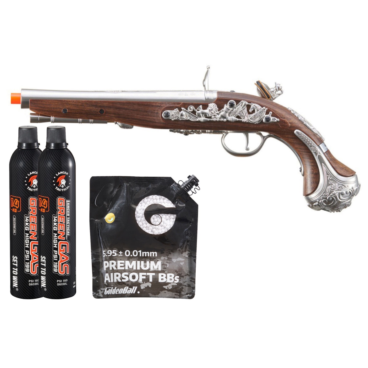 Bring a piece of early American history to your counter with the HFC George Washington Flintlock airsoft pistol Green Gas Combo Silver. Gas powered and single shot this faithful replica pairs a metal barrel assembly with faux wood furniture for convincing heft at about 2.3 pounds and an overall length of 16 inches. The flint lock style action looks and feels authentic so every press is cinematic and satisfying. Performance is smooth at an estimated 290 to 310 feet per second with 0.20 gram BBs and the fixed hop up keeps operation simple and consistent. Quality alloy build keeps it durable. A faux leather powder flask is included to carry BBs and complete the period correct experience. This ready made bundle maximizes value for airsoft dealers seeking bundled deals discounts and huge savings that boost margin and drive airsoft product sales. The combo includes Golden Ball 3000 round 0.25 gram ProSlick seamless BBs engineered for consistent feeding strict diameter control and excellent accuracy grouping and range with minimal jamming. To power the pistol you also get Lancer Tactical 12KG high PSI green gas with silicone oil that lubricates protects internal seals and helps parts resist wear while a durable metal nozzle design reduces leaks. With ammo and gas included your customers can start shooting right away and your store can present a complete solution that increases add to cart rate and in store conversion. Spotlight the combo price to show real savings versus buying items separately then list it under airsoft combo deal airsoft pistol bundle green gas deal and airsoft sale to capture search traffic and bring new buyers to your site. Stock a few at the register and feature one in a glass case to spark impulse interest and fast sell through during promotions and events for dealers.