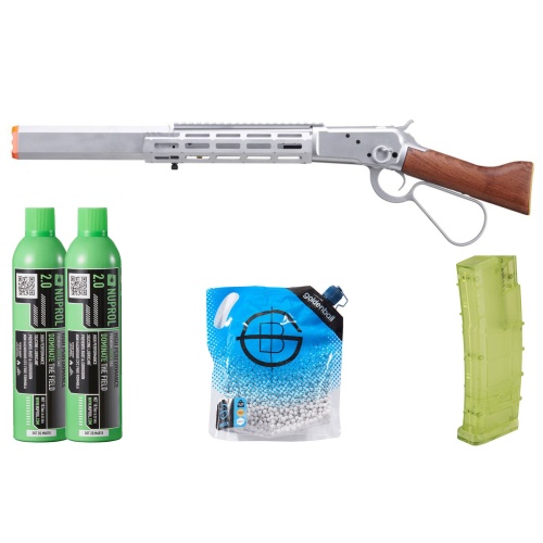 Atlas Custom Works M1873 "Mares Leg" Lever Action Airsoft Green Gas Rifle w/ M-LOK Rail and Suppressor Ammo/Green Gas Combo (Color: Silver)