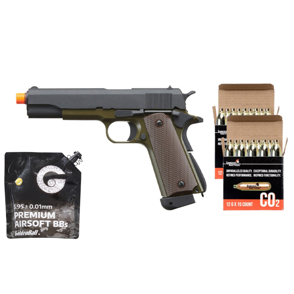 The KJW Full Metal M1911-A1 CO2 Gas Blowback GBB Airsoft Pistol - CO2 Combo - (OD Green) delivers a complete performance package for dealers seeking a proven best-seller with strong market appeal. The M1911-A1 itself is a full metal, 1:1 scale replica of the classic WWII sidearm, offering unmatched authenticity and durability. It features a reinforced recoil spring, hammer spring, and high flow valve for reliable operation under heavy use, while its realistic gas blowback action replicates the feel of firing a real 1911. The on-frame safety ensures secure handling, and the detachable magazine makes reloading quick and efficient. Its high power output delivers impressive range and accuracy, making it equally at home in competitive matches or as a collector's display piece. The OD Green finish provides a modern, tactical twist to a historical design, broadening its appeal to both re-enactors and modern skirmishers. This bundle also includes Golden Ball 3000 Round 0.25g ProSlick Seamless BBs, designed with precision-polished surfaces for consistent feeding and optimal performance in any 6mm platform. For power, the package comes with a 15-pack of Lancer Tactical High Pressure 12g CO2 Cartridges, precision-made for maximum reliability and free of internal imperfections to protect and extend the life of CO2-powered products. Dealers will recognize the value of this bundled offer three high-demand products combined into a single SKU for convenience and profit potential. Offering customers a ready-to-use airsoft pistol setup with premium ammo and dependable CO2 supply means higher conversion rates and greater repeat sales. This cost-effective, ready-to-sell combo maximizes shelf appeal, increases perceived value, and saves buyers money compared to purchasing each item separately, making it a prime choice for driving both in-store and online traffic.