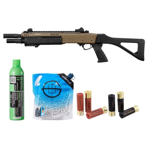 The Fabarm 33" Compact Gas Pump Shotgun Replica - Green Gas/Shell Combo - (Tan) is a premium, officially licensed airsoft shotgun designed for durability, performance, and realism. Built with a full metal body and strong polymer barrel assembly, this model features a protective Cerakote finish and an aggressively styled muzzle brake for a bold, tactical look. Its gas-powered tri-shot spread system delivers realistic performance with every pump, while the ergonomic pistol grip and triangular stock ensure comfort and stability during extended use. The fore-end includes a 20mm Picatinny under rail for easy accessory attachment, and the removable rail with a quick release pivot system allows for fast customization. Integrated sights are built into the carcass for streamlined target acquisition, making this shotgun ideal for both close-quarters battles and tactical scenarios. This ready-to-sell bundle offers maximum value to both dealers and players by including essential accessories for immediate gameplay. The set comes with 3000 rounds of Golden Ball 0.25g ProSlick Seamless BBs, engineered for superior accuracy, consistent feeding, and minimal jamming. A 6-pack of Golden Eagle Airsoft Shotgun Shells is also included, each holding 30 rounds and featuring a high-tension spring for flawless performance in triple-shot systems. For reliable power, the bundle provides Lancer Tactical 12KG High PSI Green Gas with added silicone for lubrication and maintenance, paired with a durable metal nozzle for leak prevention. By packaging a high-demand, officially licensed Fabarm shotgun with premium ammo, extra shells, and quality green gas, this combo delivers significant savings compared to individual purchases. Ideal for in-store promotions, online product listings, and seasonal sales, this bundle boosts customer appeal, drives traffic, and increases dealer profit margins by offering a complete, game-ready airsoft solution in a single SKU.