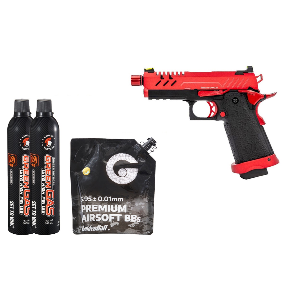 This exclusive bundle is built for airsoft dealers looking to offer customers a ready-to-play sidearm kit with huge savings compared to buying each item individually. Alongside the pistol, Golden Ball 3000 Round 0.25g ProSlick Seamless BBs provide unmatched feeding consistency, accuracy, and range in any 6mm-compatible platform, ensuring every shot counts. The package also includes Lancer Tactical 12KG High PSI Green Gas, delivering clean, high-pressure power while protecting internal components for long-lasting reliability. The metal nozzle design prevents leaks and maximizes efficiency, making it the ideal fuel for the 3.8 Hi Capa Pro. By combining a premium gas blowback pistol with high-quality ammunition and top-grade green gas, this bundle attracts online traffic through airsoft pistol sales, discount GBB packages, and complete ready-to-play deals. For dealers, it's a high-demand product that appeals to both seasoned players and first-time buyers, offering a competitive edge in-store and online with maximum profit potential.