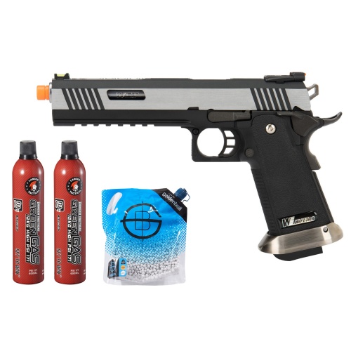 WE Tech 1911 Hi-Capa T-Rex Competition Gas Blowback Airsoft Pistol w/ Sight Mount & Top Ports - (2-Tone/Silver) Green Gas Combo
