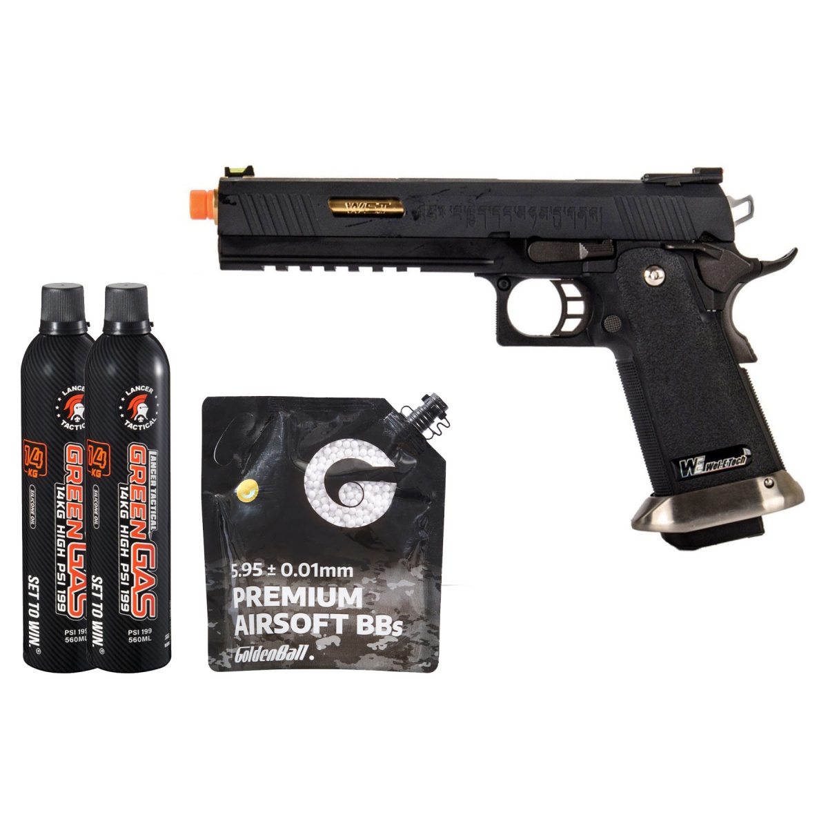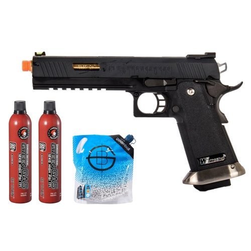 WE-Tech Hi-Capa 6" IREX Full Auto Competition Pistol - (Black/Gold Barrel/With Markings) Green Gas Combo