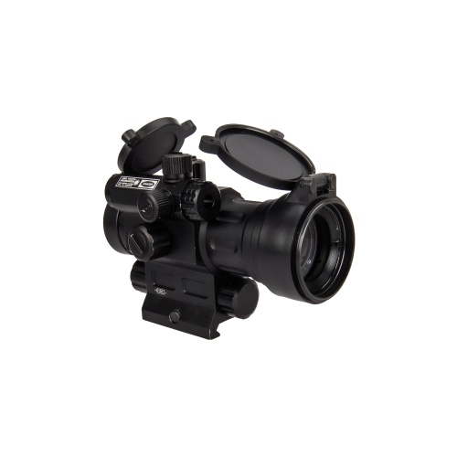 • Riser mount housing, flip up lens caps, and tool-free windage and elevation adjustments