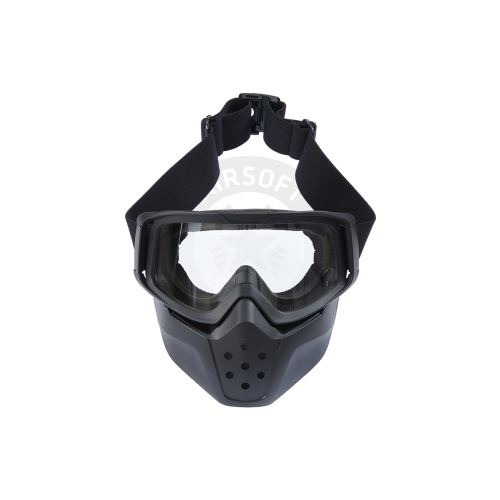 This Face Mask w/ Clear Lens Eye Protection in black offers tough TPU plastic construction, adjustable sizing, and a breathable vented mouthpiece for comfort. With non-obstructed eyepiece, it ensures clear vision and safety. Lightweight and compact, it's perfect for airsoft battles.