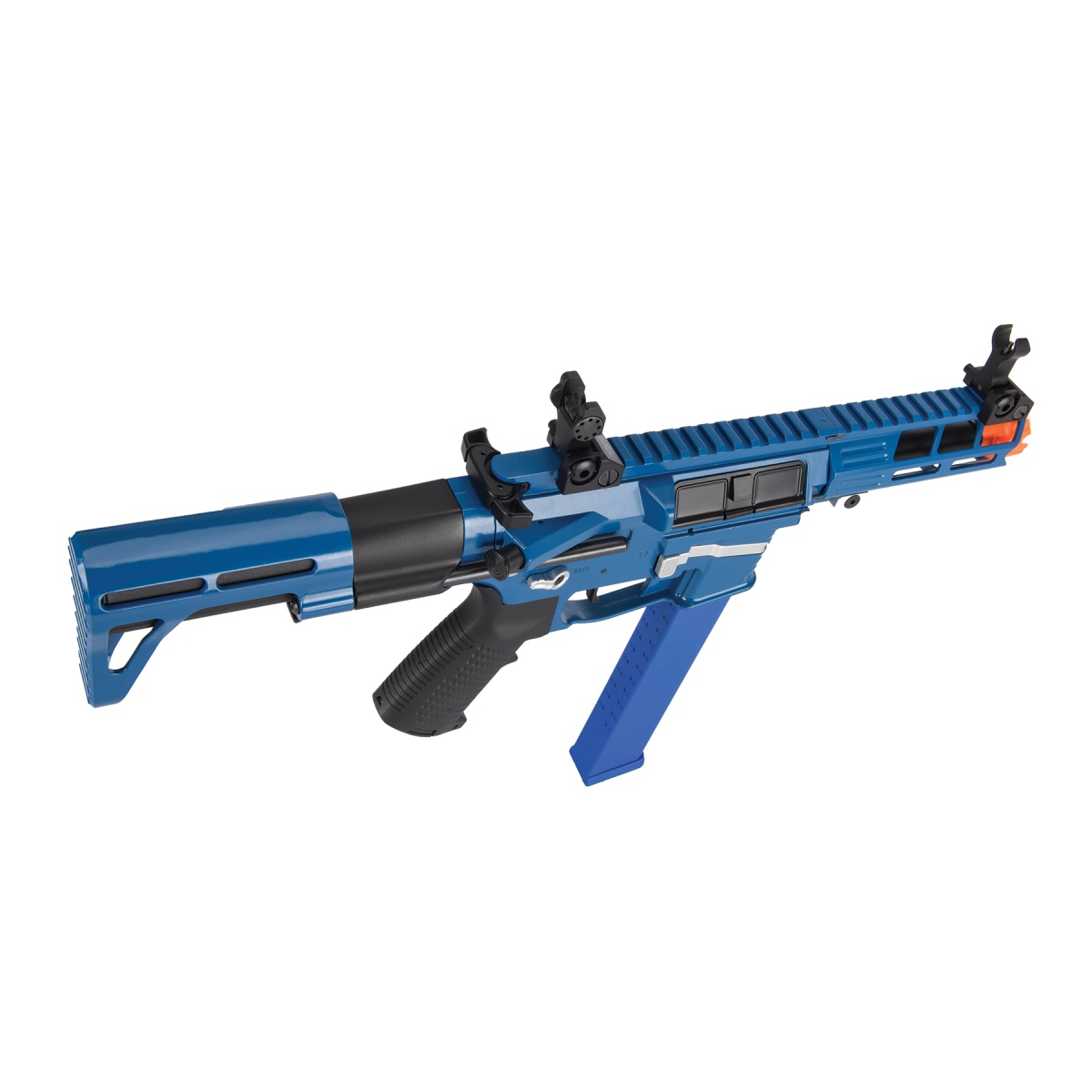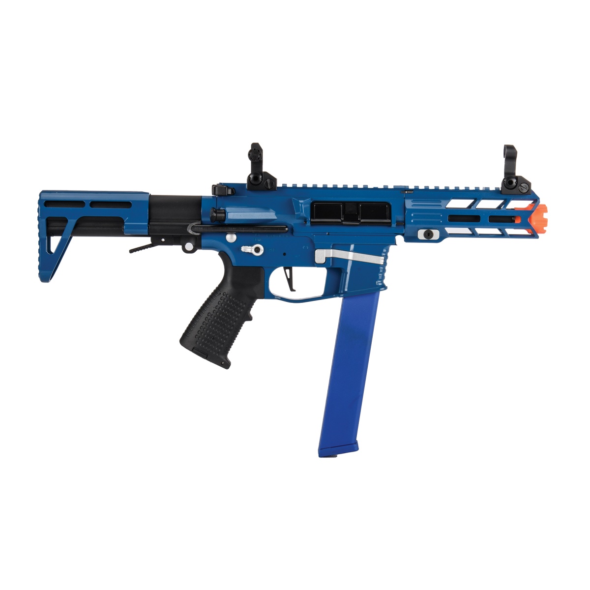 The Classic Army Nemesis X9 PDW SMG AEG in blue and silver is a compact, high-performance airsoft submachine gun built for speed, accuracy, and versatility. Designed with a full metal frame and reinforced aluminum alloy upper and lower receivers, this PDW delivers durability and realism while remaining lightweight for fast-paced gameplay. Shooting at 330 to 350 FPS with 0.20g BBs, it features an adjustable hop-up and a precision 6.03mm tightbore barrel for consistent accuracy. The Version 2 reinforced 9mm bearing gearbox, paired with low resistance wiring and a built-in MOSFET, ensures a crisp trigger response, improved durability, and efficient energy use. Its ECS system offers advanced electronic control, giving players the option of semi-auto, full-auto, or programmable 3 to 5 round burst fire modes. This makes the X9 ideal for close-quarters combat while still delivering controlled firepower. Packed with tactical enhancements, the Nemesis X9 includes a multi-position retractable skeletonized stock, flip-up front and rear sights, and an ergonomically designed high-density polymer pistol grip for superior comfort and handling. The extended battery compartment supports larger batteries, while both Tamiya and Deans connectors provide flexibility for power options. With a 120-round 9mm AR-style magazine, quick reloads are effortless thanks to the push-button magazine release. The ambidextrous fire selector, charging handle, and stock release ensure seamless usability for both left-and right-handed players. Its M-LOK handguard gives plenty of space for mounting tactical accessories like lights, lasers, and grips, enhancing customization on the field. Finished in a striking blue and silver colorway, the Classic Army Nemesis X9 PDW SMG AEG not only performs exceptionally but also stands out with a bold and modern design. Whether you're pushing through CQB environments or looking for a reliable secondary rifle, the X9 offers the perfect balance of power, style, and functionality.