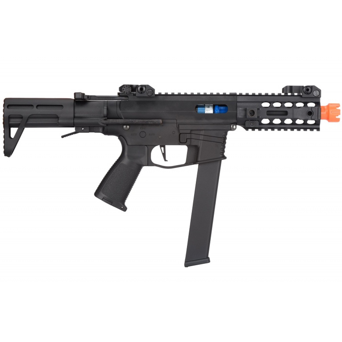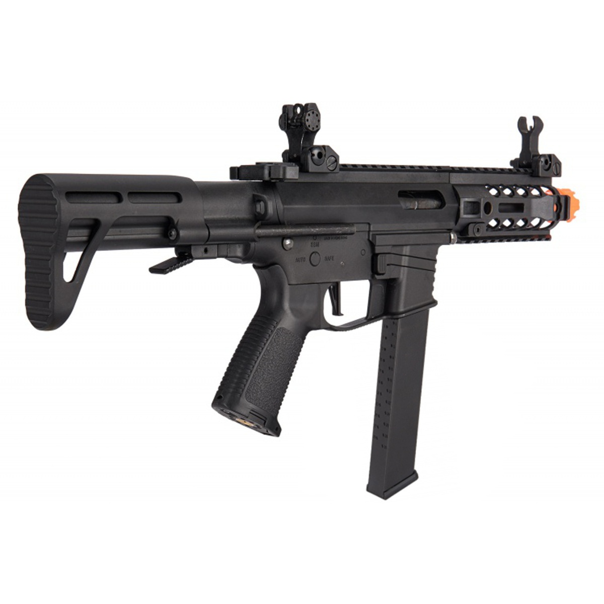 The Classic Army PX-9 AEG SMG Rifle in black delivers a perfect balance of compact size, lightweight durability, and high end performance, making it a standout option for CQB airsoft players and those who want a versatile SMG platform. Built with a reinforced nylon polymer receiver and aluminum components, this rifle weighs only 5.5 pounds, ensuring easy handling during fast paced games while remaining highly durable. Its adjustable stock allows for a rifle length between 510mm and 590mm, making it compact for close quarters yet stable for mid range shooting. Firing at 330 to 350 FPS with 0.20g BBs, the PX-9 offers reliable power within indoor and outdoor field limits. The Version 2 gearbox is paired with Classic Army's ECS mosfet trigger system, giving you advanced performance features such as 3 to 5 round burst options, motor protection, and low battery detection. With an included 120 round mid capacity magazine and compatibility with most 9mm style magazines, this AEG provides flexibility and consistent firepower. Designed for both performance and comfort, the PX-9 features an M-LOK handguard that allows players to attach lights, lasers, or foregrips without unnecessary bulk. Ambidextrous fire controls make it equally friendly for left or right handed players, while the long type motor and low resistance wiring ensure efficient operation and longevity. A 6.03mm tightbore inner barrel improves both accuracy and range, giving players a tactical advantage in tight indoor spaces or longer engagements. Rear wired to a mini Tamiya connector, this SMG is optimized for a 7.4v LiPo battery setup for consistent performance. With its combination of realistic design, customizable rail system, and modern electronic enhancements, the Classic Army PX-9 is an outstanding choice for airsoft players who want a lightweight, dependable, and highly adaptable SMG built to perform in any scenario.