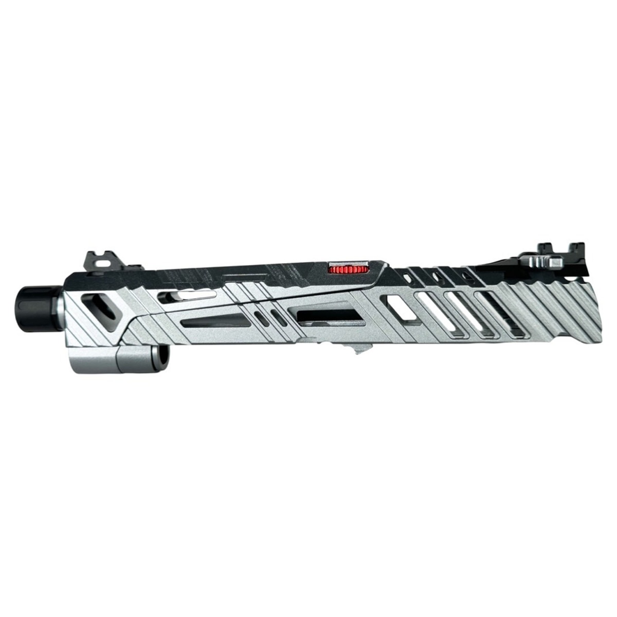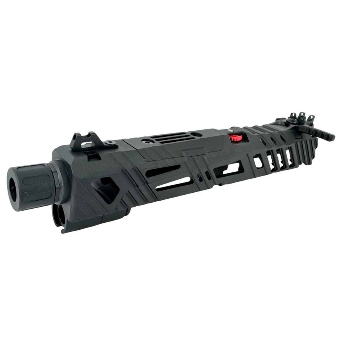 Engineered for versatility, the SUPERLINE kit includes a detachable ambidextrous charging handle that can be configured for left or right side operation, along with an integrated optic plate mounted directly to the outer barrel for a true co witness sight picture. An included optic riser plate expands compatibility for a variety of red dot setups, making it ideal for competitive shooters and speedsoft players. The 11mm CW threaded muzzle comes equipped with a 14mm CCW adapter and thread protector, allowing easy installation of tracers and muzzle devices for low light or indoor airsoft use. Additional upgrades such as an elevation adjustable rear sight, enhanced nozzle spring, and included short stroke kit improve feeding reliability and trigger response. With full slide stop function retained, the CTM SUPERLINE Hi-CAPA 4.3 Split Slide Kit delivers a refined balance of speed, control, and customization for serious airsoft users.