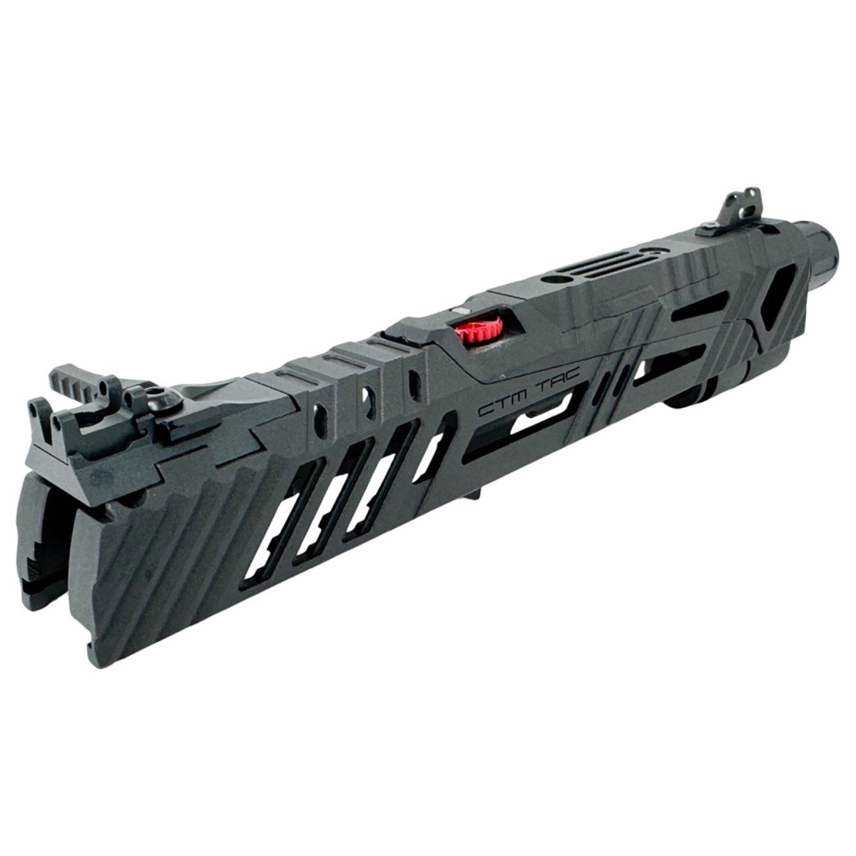 The CTM SUPERLINE Hi-CAPA 4.3 Split Slide Kit for Tokyo Marui gas blowback airsoft pistols is built for speed-focused performance and precision control in competitive airsoft environments. Constructed from high-quality 6061 aluminum, this lightweight slide system reduces overall reciprocating mass to just 35.9g, delivering faster cycling and sharper recoil response with every shot. The split-slide and fixed barrel design improves stability while maintaining smooth, agile operation, supported by a non tilting block system that keeps the outer barrel and hop-up alignment consistent under rapid fire. A tool-less TDC hop adjustment wheel allows quick and precise tuning without removing the slide, giving players full control over trajectory and accuracy during gameplay. Designed to fit both Tokyo Marui Hi-CAPA 4.3 and 5.1 spec middle frames, this upgrade integrates seamlessly into high performance custom airsoft gun builds.