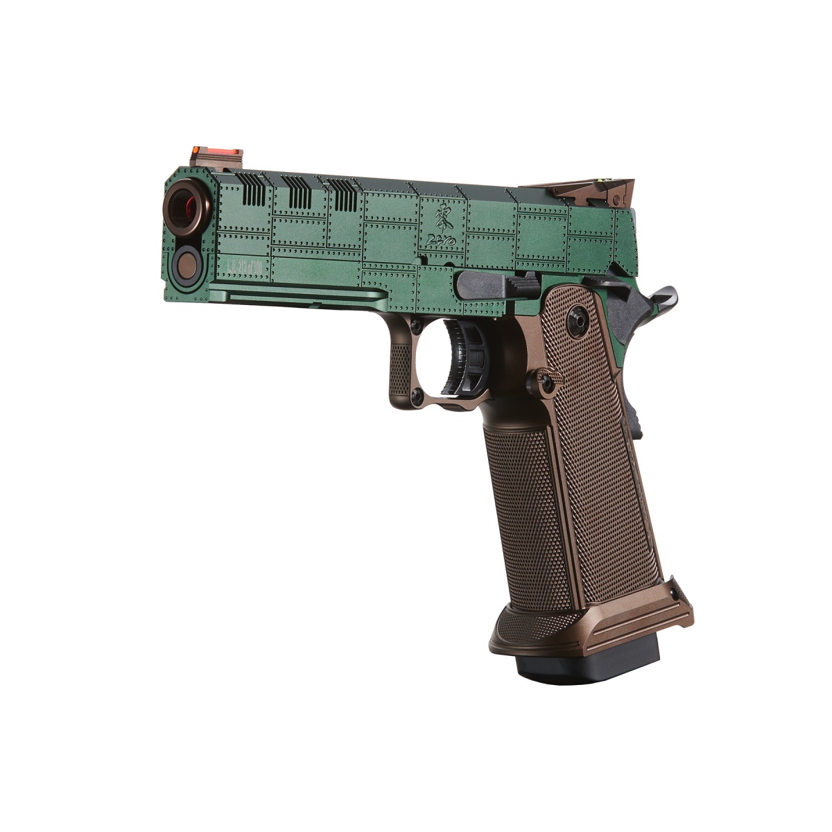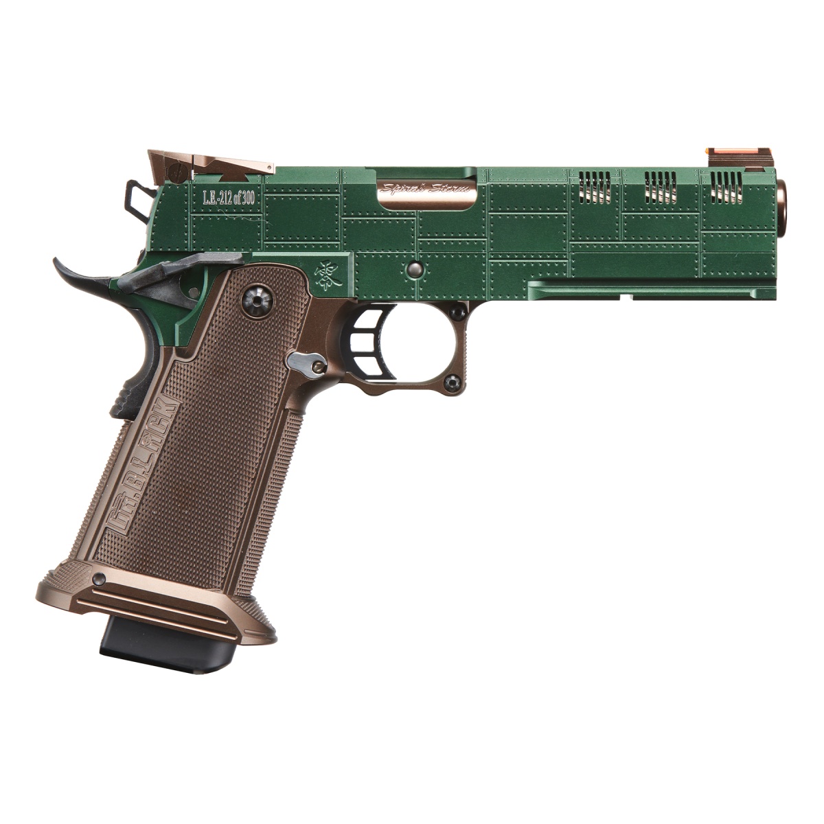 The Dr. Black "Tomiko" Custom 5.1 Hi-Capa GBB Airsoft Pistol is a rare and finely crafted sidearm tailored for airsoft enthusiasts who seek both precision and exclusivity. Built on the renowned Tokyo Marui 5.1 Hi-Capa platform, it offers exceptional accuracy, durability, and top-tier performance. The Dark Green Dr. Black Type "Zero" Slide Set not only enhances speed and efficiency but also delivers a distinctive, eye-catching design—perfect for collectors and competitive players alike.