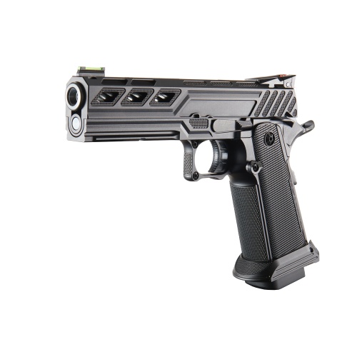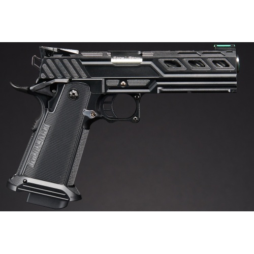 The Dr. Gearbox Custom Tokyo Marui "Type-Z" 5.1 Hi-Capa GBB Pistol is a precision-engineered gas blowback sidearm built for competitive airsoft players and collectors alike. Designed around the Tokyo Marui 5.1 Slide Set "Type-Z", this custom Hi-Capa offers a sleek all-black finish with authentic slide engravings, giving it a unique and aggressive aesthetic. The high-strength polymer slide ensures durability while keeping the weight low for faster follow-up shots. A double-stacked magazine provides an expanded 31-round capacity, allowing for sustained fire during intense skirmishes. The adjustable rear sights and fiber optic front sight enhance target acquisition for rapid and precise aiming. The lower frame includes an optional rail attachment, enabling easy customization with optics, flashlights, or lasers, making it an incredibly versatile pistol for any airsoft scenario.