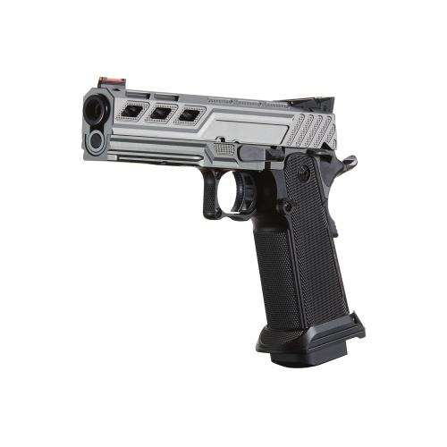 With a black metal outer barrel that adds a bold, tactical edge, the Zeta is built to make an impact. Its fiber optic front and rear sights enable rapid and precise target acquisition, making it ideal for competitive airsoft and tactical scenarios.