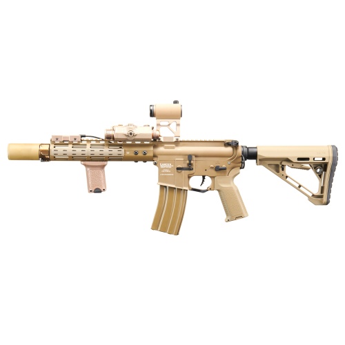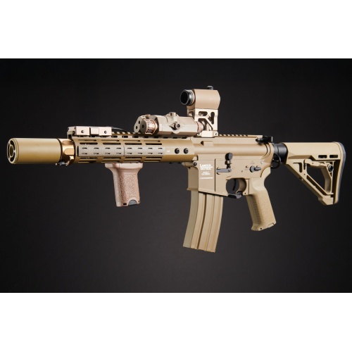 Available now, the Custom Brimstone Lancer Tactical Archon 9 inch M LOK Proline Series M4 Airsoft Rifle with Delta Stock is built for players who want high performance and reliable durability in a compact, versatile platform. Constructed with full metal receivers, handguard, and outer barrel paired with a polymer Delta stock and motor grip, this tan M4 airsoft rifle combines rugged realism with lightweight handling. Firing at 370 to 380 FPS with .20g BBs, the reinforced full metal Version 2 gearbox is powered by a 25k high speed neodymium motor, steel gears, and a steel tooth piston for smooth cycling and long lasting reliability. The Lancer Electric Trigger Unit with cutoff system ensures crisp trigger response and enhanced accuracy, while the rotary style hop up and quick change spring system allow for precision tuning whether you play indoors or outdoors. At just 4.5 pounds and adjustable from 26 to 29.5 inches, this rifle is compact, maneuverable, and ready for intense action. The Custom Brimstone build comes preloaded with a curated selection of upgrades designed to elevate performance and style. The Atlas Custom Works SOCOM QD barrel extension adds a full metal suppressor look, while the BCM vertical grip and Ranger Armory M LOK rail covers improve handling and control. Optics are handled by the Atlas Solar Power red dot with killflash on a Unit Lite mount, giving fast target acquisition in all conditions. For enhanced versatility, an ACW LA 5 PEQ15 illuminator with IR laser and a pressure switch rail mount are included. Internals get a major boost with a Maple Leaf 6.02mm inner barrel, Maple Leaf Super Macaron bucking, Maxx CNC hop up chamber, SHS 13:1 steel gears, a reinforced piston, Solink brushless motor, and Titan V2 expert module for ultimate trigger tuning. Packaged with a Code 11 36 inch rifle bag, this upgraded Proline rifle is field ready and optimized for competitive airsoft.