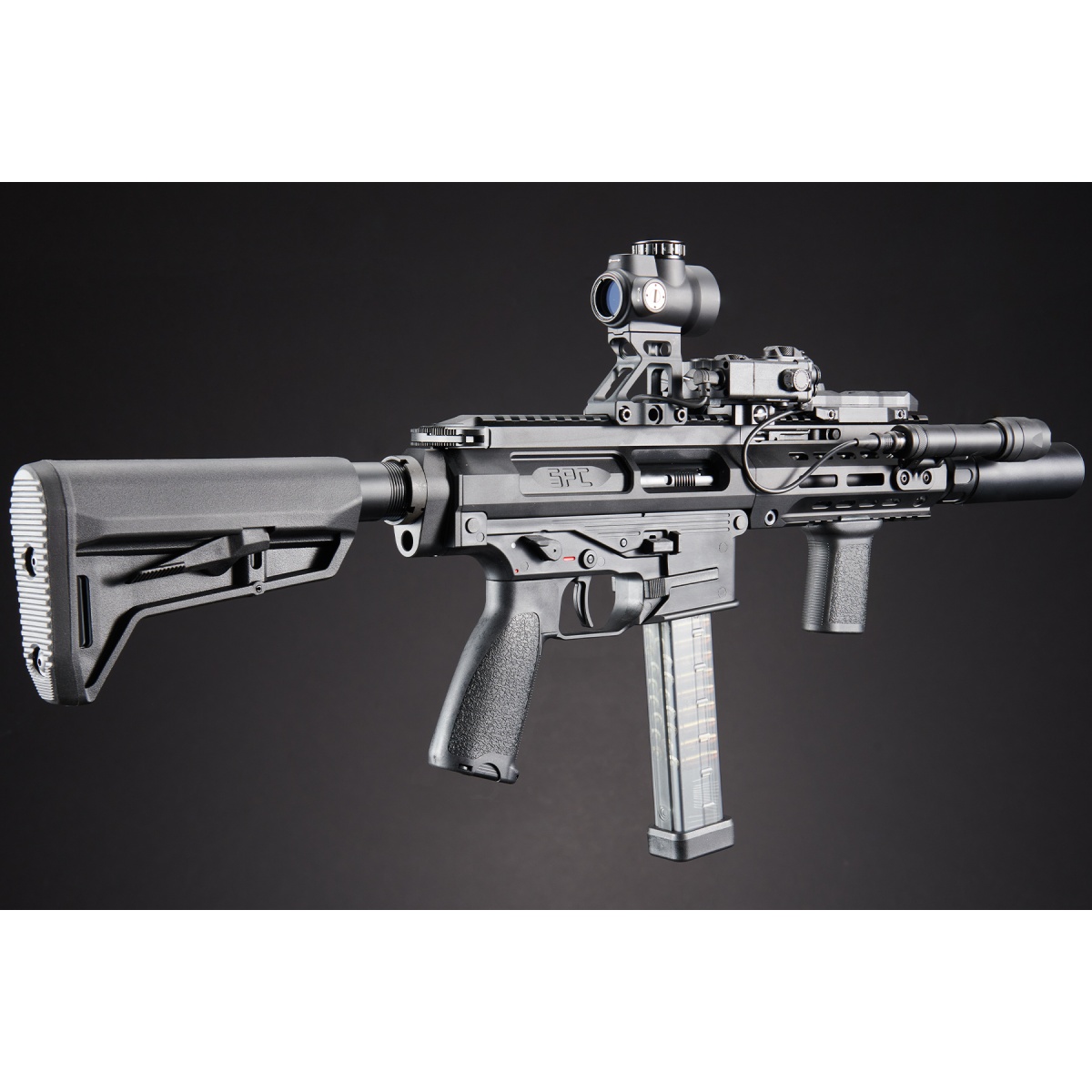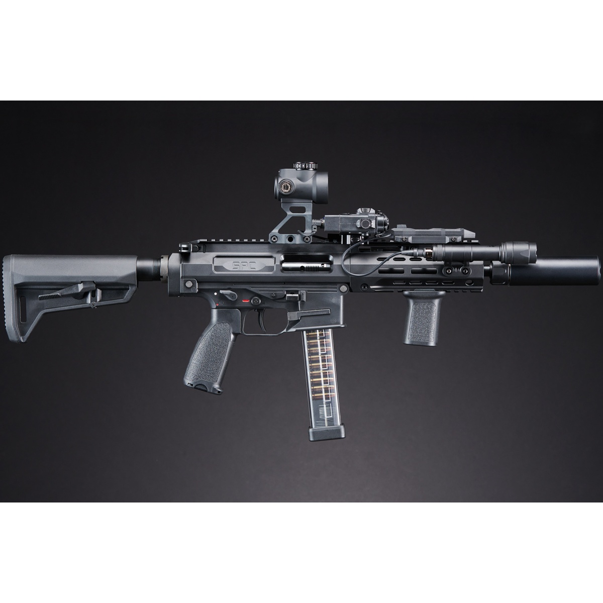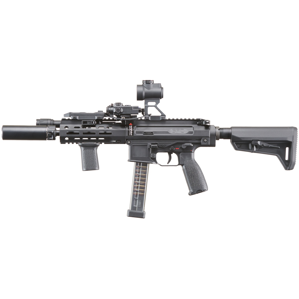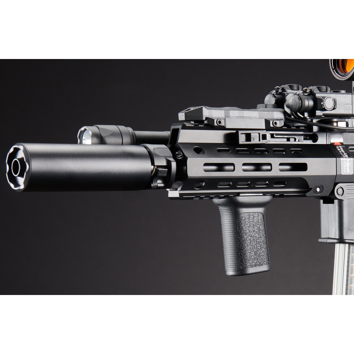 The Custom Maruyama NOX - 5PC Carbine GBB Airsoft Gun (Black) is a premium gas blowback rifle built for realism, reliability, and modular customization. Manufactured in Taiwan with precision Japanese design, this full-metal GBB rifle utilizes VFC-spec internals, delivering smooth cycling and crisp recoil with every trigger pull. It operates on green gas and shoots around 320 FPS with an adjustable hop-up for consistent accuracy. The robust hybrid build-featuring aluminum alloy, reinforced polymer, and steel components-ensures durability while keeping the platform lightweight for maneuverability. Whether you're engaging in full-auto CQB or semi-auto mid-range encounters, the NOX offers adaptable performance and rock-solid handling. With ambidextrous controls, a collapsible carbine stock, and adjustable sights, it's tuned for both right and left-handed users in diverse airsoft scenarios. Outfitted with a series of high-performance upgrades, this build is competition and field-ready. It includes the Unicorn 6.03mm precision inner barrel and upgraded bucking for enhanced accuracy, the Atlas Custom Works SOCOM QD barrel extension, and MRO 45-degree offset red dot sight for versatile aiming setups. A vertical foregrip, enhanced pistol grip, and ACW DBAL-A2 red/IR laser provide ergonomic control and superior target acquisition. Illumination is covered with the M640C 640-lumen scout light, powered by Lancer Tactical CR123A batteries, and managed by a Ranger Armory dual pressure switch for seamless control of your laser and light. This carbine also features QD sling points, a QD barrel suppressor system, and robust optics mounts for complete tactical flexibility. Perfect for experienced players or collectors, the Maruyama NOX offers a fully upgraded, visually aggressive GBB rifle platform that dominates in realism and battlefield presence-available now to take your airsoft loadout to the next level.