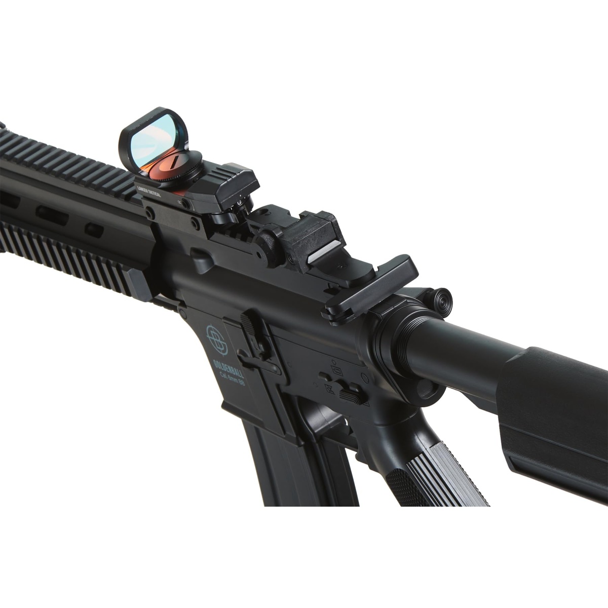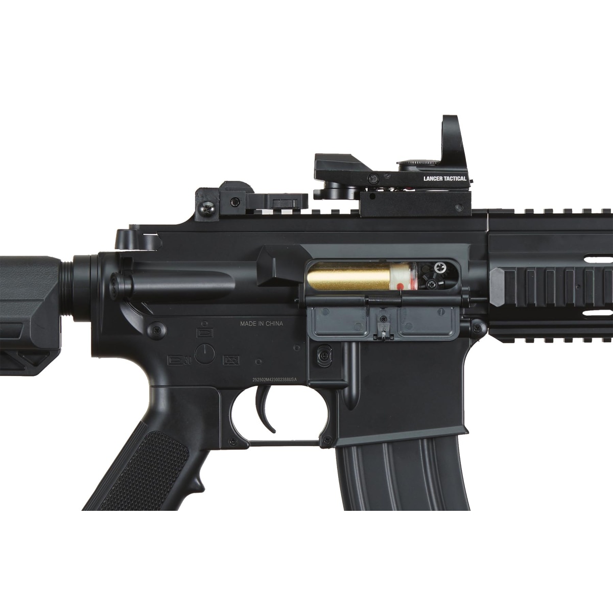 The GoldenBall K418 Tactical RIS AEG Airsoft Rifle is a complete, ready-to-run platform built for players looking to step into airsoft with a reliable and adaptable setup. Powered by an electric AEG system, this airsoft rifle delivers consistent performance with selectable semi automatic and full automatic firing modes, giving players flexibility across both CQB and outdoor environments. Constructed from durable ABS plastic, the K418 maintains a lightweight 3.5 lb profile while offering the strength needed for repeated field use. The adjustable tactical stock features an integrated battery compartment, improving balance and keeping the setup streamlined. An adjustable hop up system allows users to fine-tune accuracy and shot consistency, while the included high capacity magazine supports extended gameplay with minimal downtime. Metal flip up front and rear sights provide dependable aiming, and the included red dot sight with dual illumination and adjustable brightness enhances target acquisition in varying lighting conditions.
