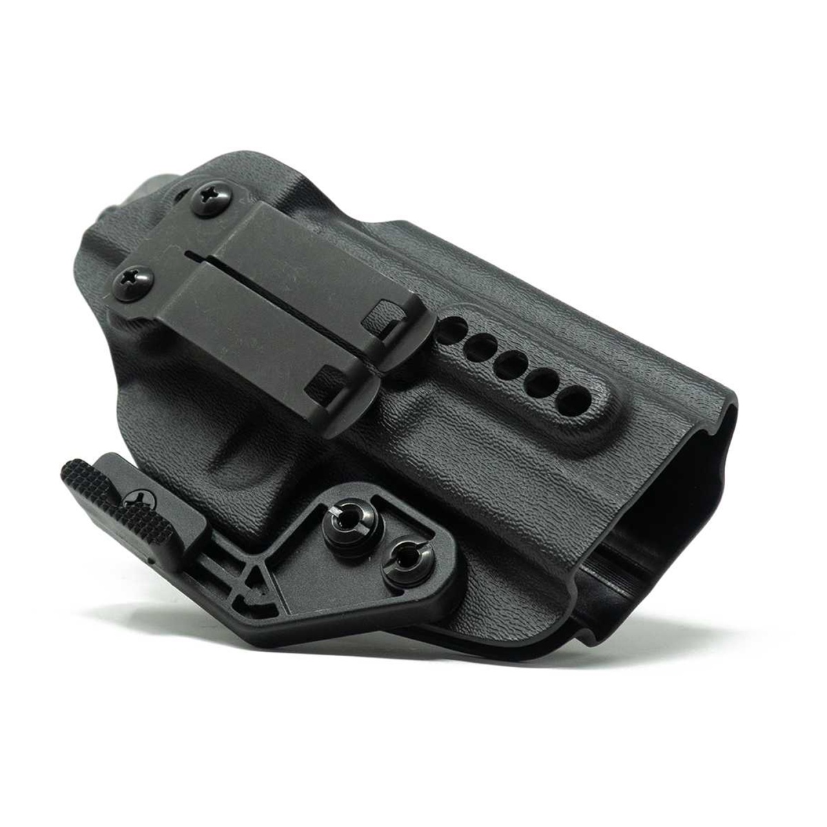 The GBRS Group x Priority 1 IWB Right Handed Glock Holster in black is a premium concealed carry solution designed for shooters who demand reliability, comfort, and precision. Built from 0.080 Boltaron, this holster is rugged yet slim, providing long-lasting durability without unnecessary bulk. It is CNC trimmed, hand finished, and test fit to ensure exact tolerances and superior quality control. The holster features adjustable screw-on retention for a personalized draw and adjustable cant options of 0 or 15 degrees to suit your carry preference. A full sweat guard keeps the rear sight from contacting the body, while the concealment wing rotates the grip inward for improved stability and reduced printing. The discreet carry monoblock clip firmly secures the holster inside the waistband, whether worn with or without a belt, while the adjustable ride height accommodates tuckable belt attachments for flexible concealed carry setups. Engineered for modern everyday carry and professional use, the holster is optics cut ready with a molded RMR channel, ensuring compatibility with most slide-mounted red dot optics. It also supports aftermarket tall suppressor-height sights and features an open muzzle design to accept threaded barrels or compensators. This makes it an ideal option for Glock owners who run upgraded or customized pistols while still requiring a reliable IWB holster. Compatible with Glock 9mm and .40 caliber models, this holster is proudly made in the USA and Berry Compliant, reflecting strict quality and compliance standards. Lightweight, comfortable, and designed with attention to detail, the GBRS Group x Priority 1 IWB Glock Holster provides the perfect balance of concealability, accessibility, and durability. Available now, it is a must-have for anyone seeking a top-tier Glock holster that excels in performance and modern carry requirements.