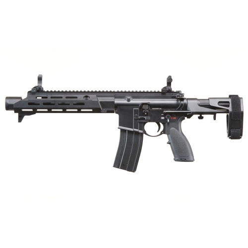 The Golden Eagle GBBR Airsoft Rifle w/ 11 Inch M LOK Handguard and Mock Amplifier is a compact and aggressive gas blowback rifle built for players who demand realism and fast handling in close quarters gameplay. Its short 11 inch M LOK piston driven handguard makes the rifle lightweight and maneuverable, while providing ample space for tactical accessories such as grips, lights, and lasers. The included mock sound amplifier not only adds a bold aesthetic but also enhances the auditory presence of every shot, making this rifle stand out during matches. Built in black with a durable finish, the rifle comes equipped with fully ambidextrous controls including fire selector, magazine release, and bolt catch, making it versatile for both left and right handed users. Flip up sights adjustable for windage and elevation ensure reliable accuracy, while the 4 position PDW stock with brace strap allows quick length adjustments for close quarters or field play. Performance oriented features make this rifle an excellent option for competitive players and enthusiasts. The ergonomic pistol grip provides comfort and control, the enlarged trigger guard allows for gloved use, and the enhanced charging handle ensures smooth and reliable cycling. The 14mm CCW threaded barrel expands customization options, letting players swap in tracer units or other muzzle devices as needed. With realistic blowback operation, the Golden Eagle GBBR Series Rifle delivers an immersive experience that replicates the handling and function of a real firearm. Available now, the Golden Eagle GBBR Airsoft Rifle with 11 Inch M LOK Handguard and Mock Amplifier combines realism, tactical features, and unique styling for an unbeatable CQB ready platform.